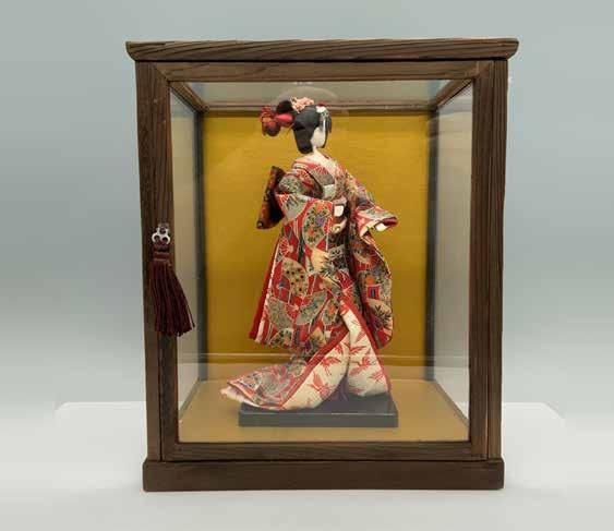 A doll dressed in a red geisha outfit adorned with floral sensu fans stands gracefully posed within a glass case framed by wooden borders against a yellow background. Dimensions of the doll: 4.75”L x 4”W x 10.5”H.