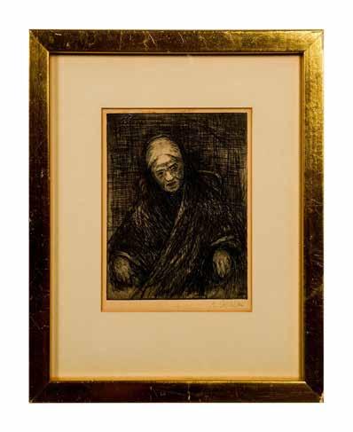 Original black & white etching on paper on board of a Jewish woman wrapped in a shawl with her head lowered as she rests on an armchair set in a bare interior. The artist used different drawing techniques of crosshatching and single lines to render the highlights and the darkened areas. Signature in pen on lower right: illegible. Housed in a gilded frame with an ecru mat. Sight size: 5.10”L x 6.75”H. Frame size: 10”L x 12”H x 1.20”W.