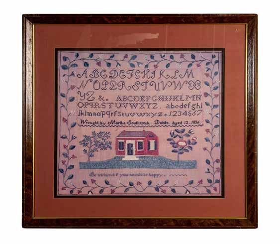 Housed in a wooden frame with a pink mat. Depicts an embroidered stitching of a house and the alphabet. Frame size: 27.25”W x 26”H x 1”D. Sight size: 18.75”W x 17.75”H.