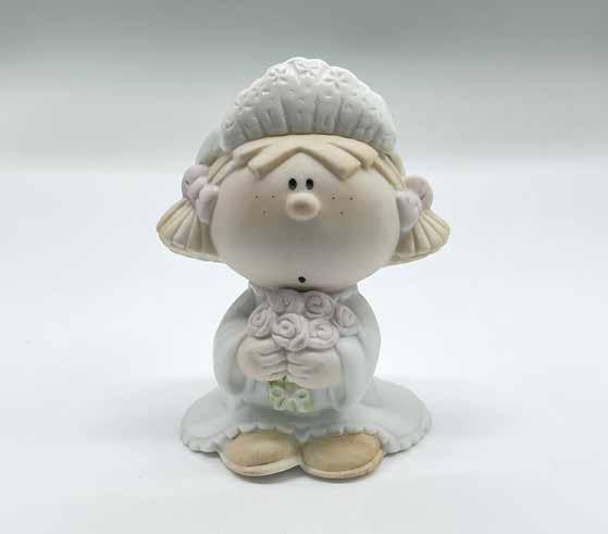 Matte porcelain figure of a bride in her wedding dress and veil holding a bouquet of pink roses. Bumpkins by Fabrizio backstamp.