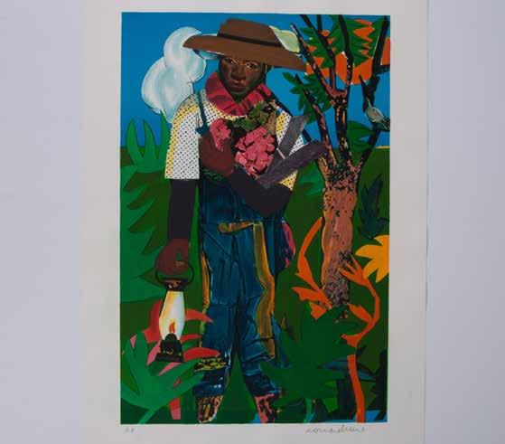 A vibrant original color lithograph on paper entitled The Lantern by American artist Romare Bearden. From the limited Artists Proof edition. Artists signature in plate on lower right. A.P in graphite on lower left.