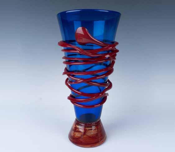 A vibrant blue glass vessel with a flared base featuring a swirling amber art glass design, adorned with applied dark red glass trailing.