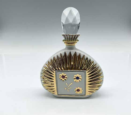 Elegant glass bottle and cup featuring a smooth, graceful shape, beautifully adorned with frosted accents on dancing flowers. Bottle: 3.75”L x 6”H. Cup: 2.25”L x 3.25”H.