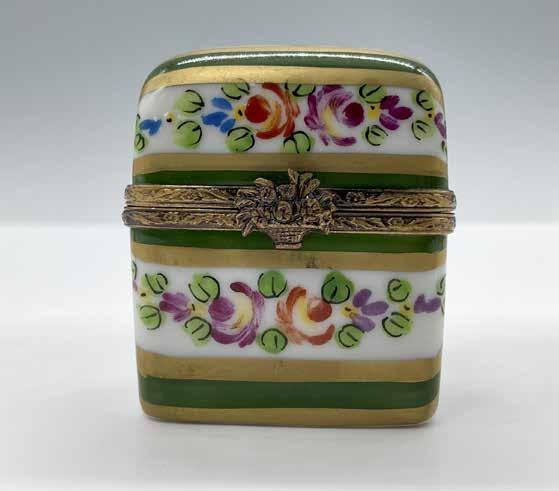 Hand painted in Limoges France. Limited edition. A little chest with a striped painted flowers pattern, gold accents and a metal flower closure. Signed Peint Main Limoges France 9/50.