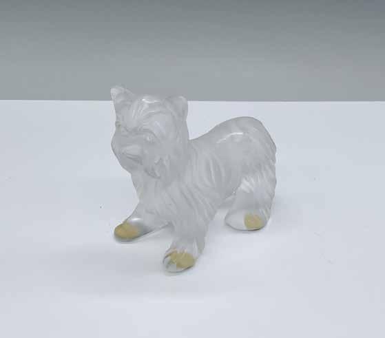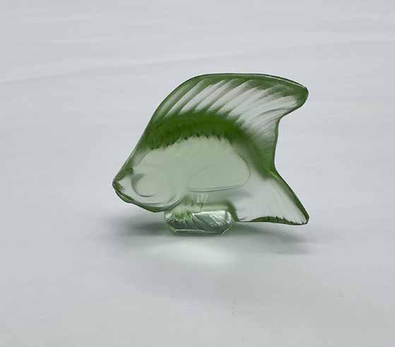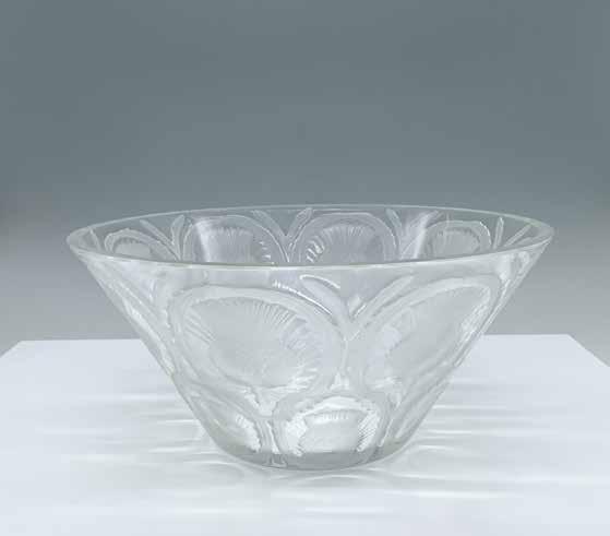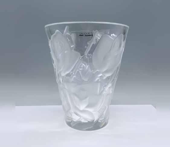 Clear crystal set featuring a frosted crystal leaf pattern accent. Lalique Stickers and Lalique inscription at the bottom. This item includes its original box: 12.25”L x 9.5”W x 4.75”H. 1734500.