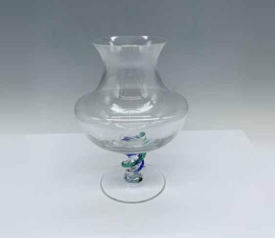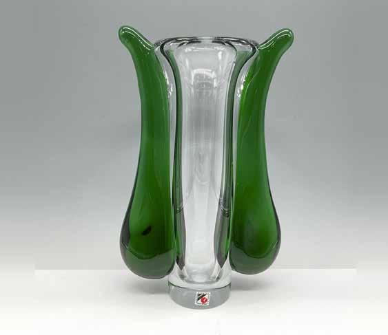 Stunning, Jaoslav Svobada (b. 1938) handmade unique design of transparent and green glass utilized to create this unusual vessel. Signed by artist. Svoboda Karlov Glass tag. Born in 1938 in former Central Bohemia, Svoboda entered the world of glass making at a young age in his father’s workshop at Inwald Glassworks. Svoboda would pursue the arts academically at the age of 15 before officially beginning his career in glass in 1966. later, Svoboda would go on to become the Head of the UUR Glassworks in Skrdlovice, ultimately becoming Professor and Head of the Glass Studio at the Academy of Arts, Architecture, and Design in Prague. Svoboda went on to establish his own Glassworks Studio in Karlov.