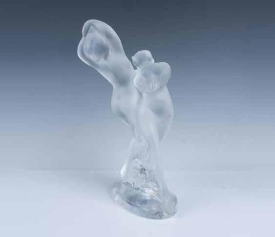 A clear glass with a frosted stem depicting the faces of seven women intertwined and flowing to the base. Erte engraved at base. State II etched at the bottom. This item has its original box: 12.75”L x 4”W x 3.5”H.