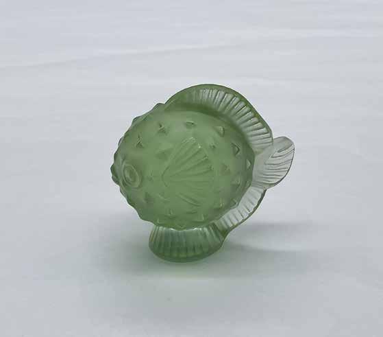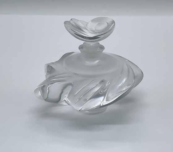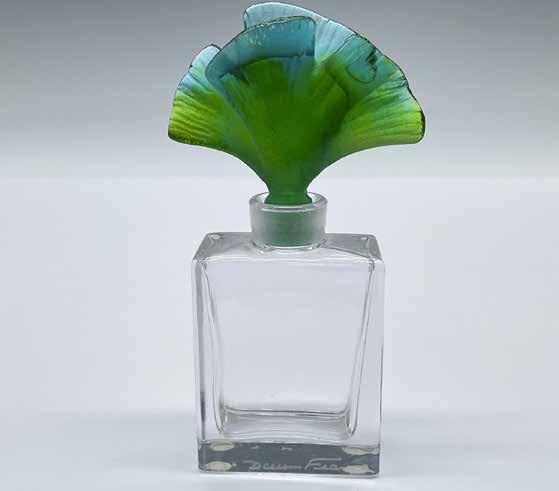 A small clear bottle adorned with a green-blue stopper with iconic fanshape leaves. Marked Daum France on the bottle.