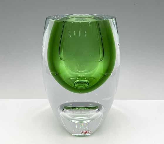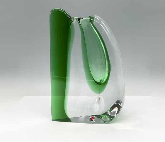 Jaroslav Svoboda (b. 1938) designed abstract form with green and clear cased glass. Svoboda Karlov Czech Republic tag and artist signed. Born in 1938 in former Central Bohemia, Svoboda entered the world of glass making at a young age in his father’s workshop at Inwald Glassworks. Svoboda would pursue the arts academically at the age of 15 before officially beginning his career in glass in 1966. later, Svoboda would go on to become the Head of the UUR Glassworks in Skrdlovice, ultimately becoming Professor and Head of the Glass Studio at the Academy of Arts, Architecture, and Design in Prague. Svoboda went on to establish his own Glassworks Studio in Karlov. Svoboda’s glasswork is represented in numerous museum collections around the world, including the Corning Museum of Glass in New York, The National Gallery in Prague and the Kunstmuseum fur Kunst und Gewebe in Hamburg.