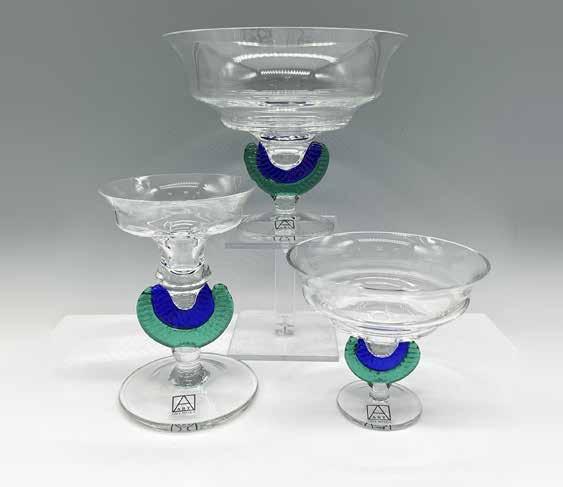 Lovely clear glass bowls with designed blue and green glass stems. Three sizes are included 4.75”H, 6.75”H. Art Czech Republic tags. Largest piece 6.75”H x 8” dia.