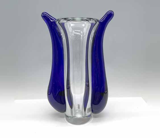 Spectacular clear vase design by glass artist and designer Jaroslav Svoboda (b. 1938) from his own glass works studio Svoboda Karlov. This exceptional vase has a tall, slender body, adorned with two royal blue-green teardrop shaped grip handles. Signed at the base by the Jarolsav Svoboda with Czech Republic sticker. Born in 1938 in former Central Bohemia, Svoboda entered the world of glass making at a young age in his father’s workshop at Inwald Glassworks. Svoboda would pursue the arts academically at the age of 15 before officially beginning his career in glass in 1966. later, Svoboda would go on to become the Head of the UUR Glassworks in Skrdlovice, ultimately becoming Professor and Head of the Glass Studio at the Academy of Arts, Architecture, and Design in Prague. Svoboda went on to establish his own Glassworks Studio in Karlov. Artist: Jaroslav Svoboda (b. 1938)