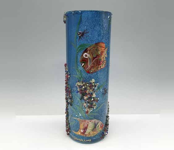 Creative handmade and hand painted design of aquatic life on aqua blue cylinder with applied colored beads and enameled paint to enhance the design. Signed and dated by artist, C. Hommer 2003.