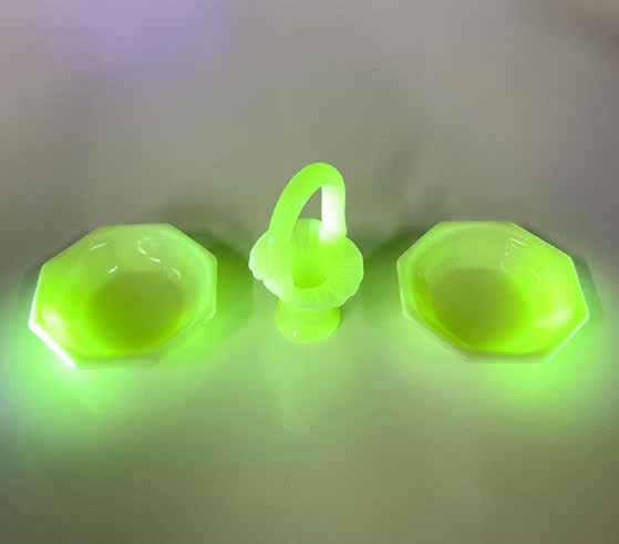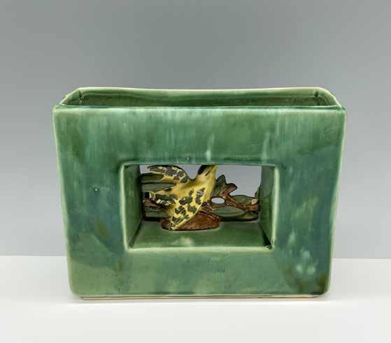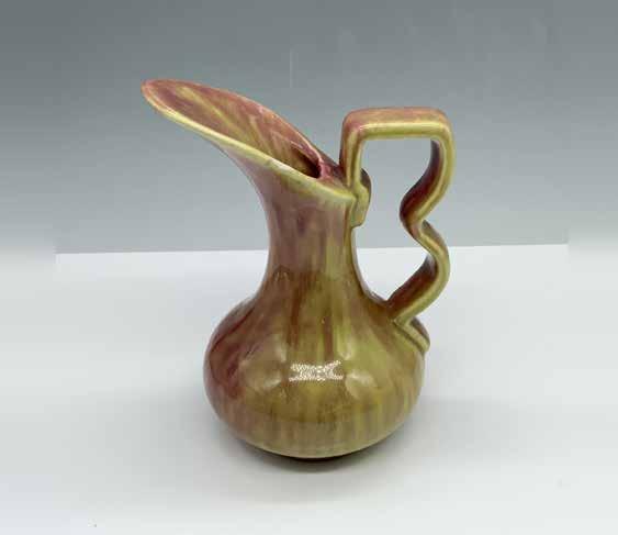 Lovely handmade Bohemian glass with pulled colors of yellow, blue and brown over green glass. Squat vessel with long neck and flat rim measures 5.5”H x 7” dia. and small triangle vase measures 4.75”L x 4.75”W x 3.75”H. Atelier Beranek Glass tag.