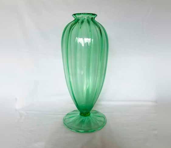 Inspired by Napoleone Martinuzzi (Italian, 1892-1977) design, a light green costolato footed vase. Vase approximately: 6.1”W x 13.1”H.