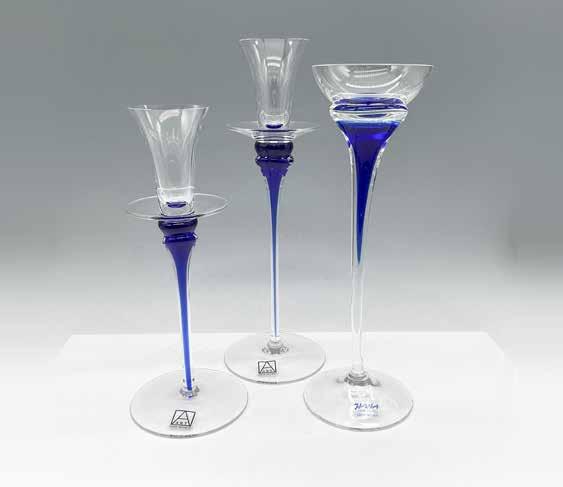 Lovely, cased glass holders in cobalt blue with round clear base. Elegant centerpiece design can be created with 9.75”, 11” & 12” holders. Hana Studio and ART stickers. Largest piece 12”H x 4” dia.