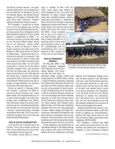 cling it, entitled “A Man From Another Land” about how finding my roots changed my life. For those who dreamed of being football players, track stars, baseball players, doctors, astronauts and lawyers. I dreamed of Africa. At the time I thought I was being plagued by this particular dream – a peculiar dream that was the exact same dream that came into fruition on May 28, 2006. I never revealed this to any of my family or my tribal brother, again for fear of being ridiculed. It’s a daunting task to know what your purpose is early in life. It’s unexplainable and it’s overwhelming. But I can release all of that – today. And I thank you for that freedom. WHO IS GONDOBAY MANGA? On May 28, 2006 I was The Foday Golia Memorial School Before (top) tribally baptized, adopted and After The Gondobay Manga Foundation and inducted as Chief Gondobay Manga. The honorary title has now been “legitimized” today. Largely ratified and fighting. The Gondobay Manga name recognized at my official ribbon-cutting has not been used for over 300 years in Njala Kendema yesterday. Opening until now. I was told that there was folkthe Foday Golia Memorial School that lore that there would be “a man from services over 250 students today, was another land” that will join in the effort my gift to the people of Sierra Leone. to re-claim and restore Sierra Leone I have travelled around the continents to its former greatness. Mr. President, of Africa and North America looking at I am honored to be the first African ruins and buildings that have landmark American to receive this citizenship, placards on them from Bunce Island, but I will assure you I will not be the South Carolina to Georgia. Slave cab- last. You sir, have sparked a fire that ins. Slave castles. And I always had a will spread throughout the continent of different take. One that was completely Africa and throughout the world. separate from the one I was supposed I believe that DNA has memory. I beto have - Malice, Anger and Rage. All I lieve that if the slave traders could have could see, although the blueprints had known to destroy our chromosomes I been laid by our enslavers and our op- believe that they would have so that pressors, were that these ruins are still this connection today could have never standing much like the pyramids simply happened. [APPLAUSE] because they were “built” by our hands. Mr. President, I believe that DNA In that rebuilding I now stand here as has memory and once and for all. Our Gondobay Manga II. Gondobay Manga brothers and sisters can now begin to was a warrior who came from Kono to “awaken” to their individual ancestral defend the Kono Settlement and died