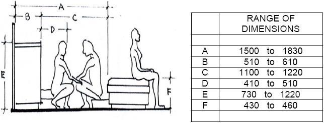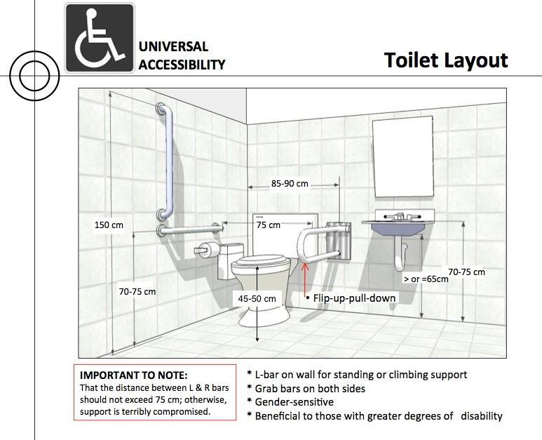 Provide an option for high and low lavatories, 750-800 mm maximum height from floor for adults, and 700-750 mm for children. Lavatories must have no obstruction underneath. A faucet with a single lever can easily be operated with one hand. Consider a faucet that incorporates infrared sensor to initiate water flow. Shower grating as drain can be very efficient for people in wheelchair.