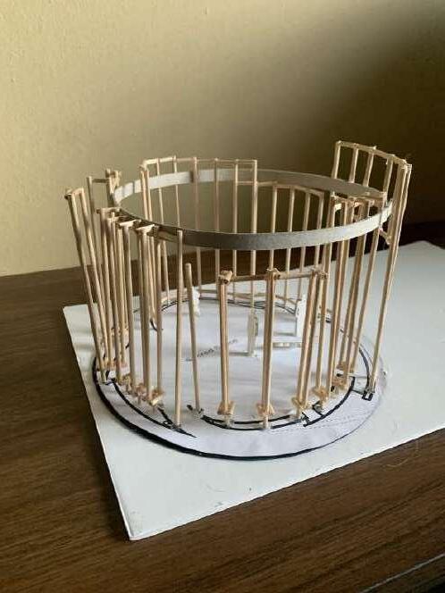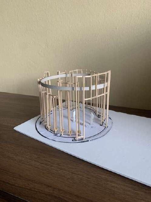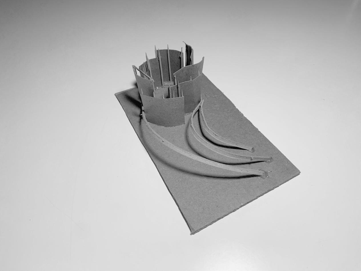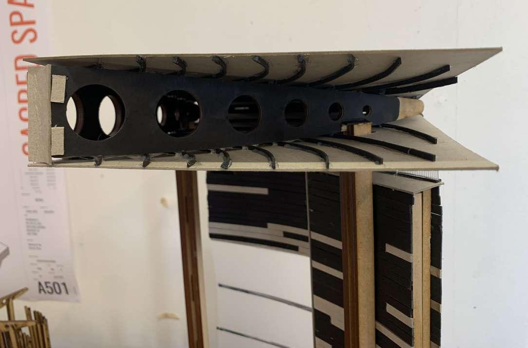 It was in this act of model-making that I developed the scheme of having a main chapel that is completely under the roof and protected. Additionally, a curved timber installation on the exterior will wrap (hugs) the main chapel structure. This timber installation will provide a degree of shading but, more importantly, a place for social gatherings.