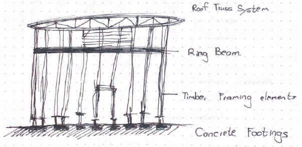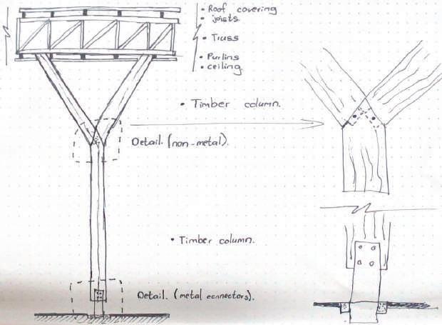 Organic, slanted SA Pine columns as per SANS 1783-2/1460/10149 fixed at the base and top with 12mm M/S plate bolted with M12 bolts