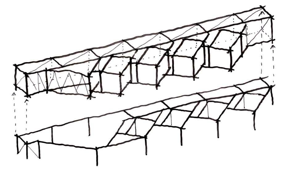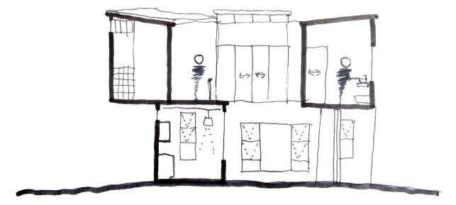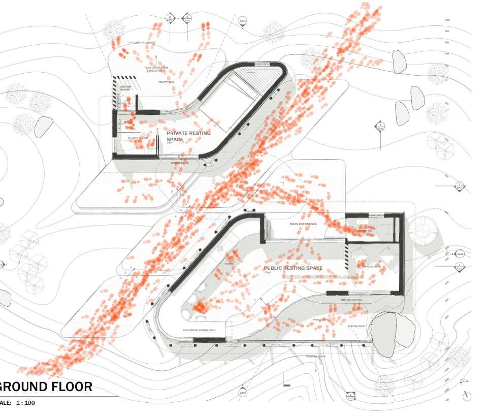 Movement diagram Roof Timber beams roof structure Skylight I-Beam Lintels Public resting space timber roof support structure Private resting space Public interior Public exterior (threshold) Private Exterior Semi-private interior Private interior (WC)