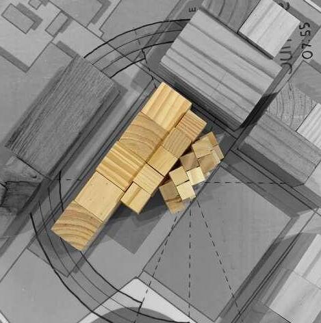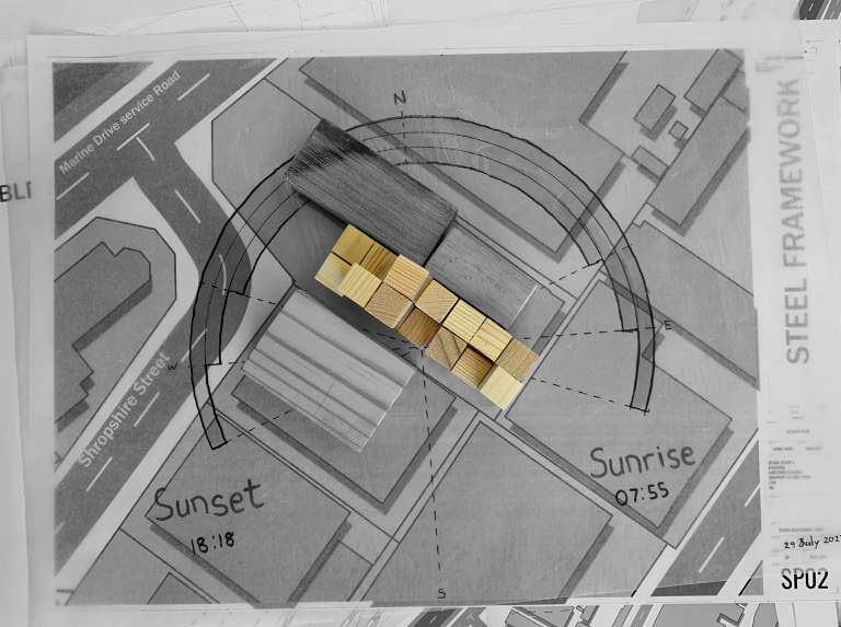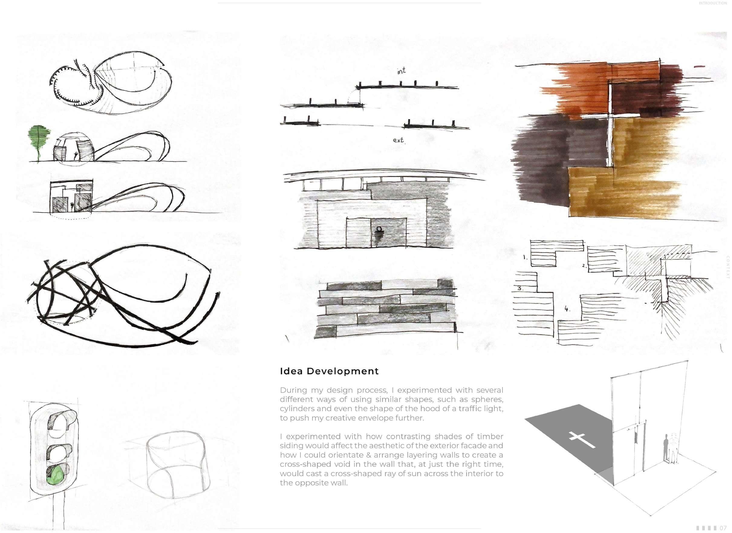 1 experimented with how contrasting shades of timber siding would affect the aesthetic of the exterior facade and how I could orientate & arrange layering walls to create a cross-shaped void in the wall that, at just the right time, would cast a cross-shaped ray of sun across the interior to the opposite wall.