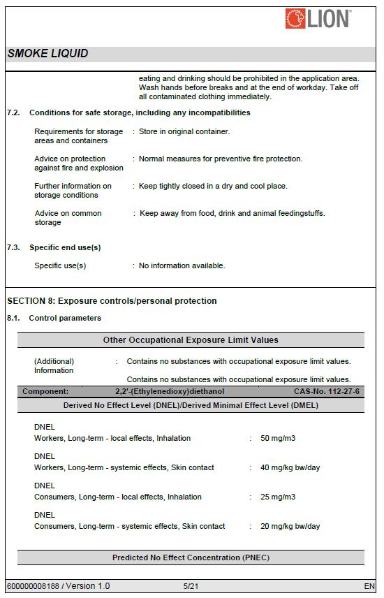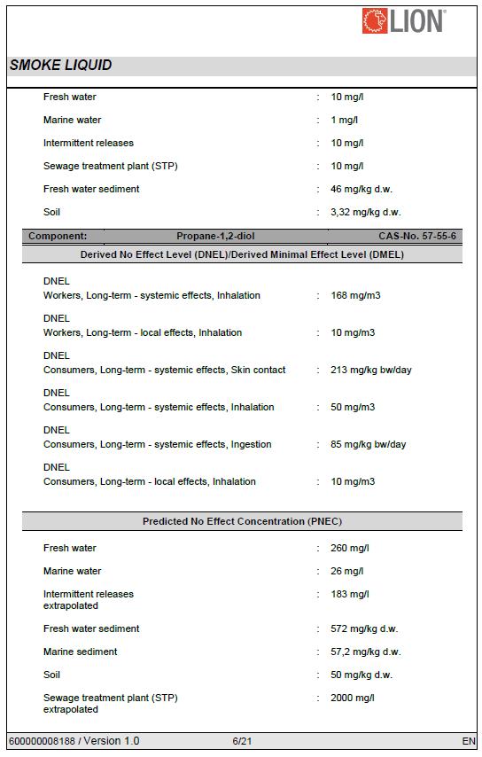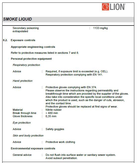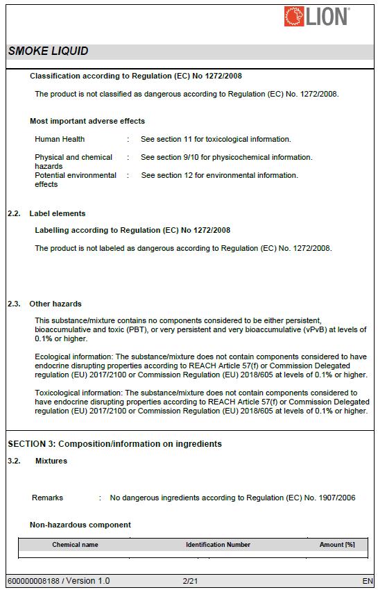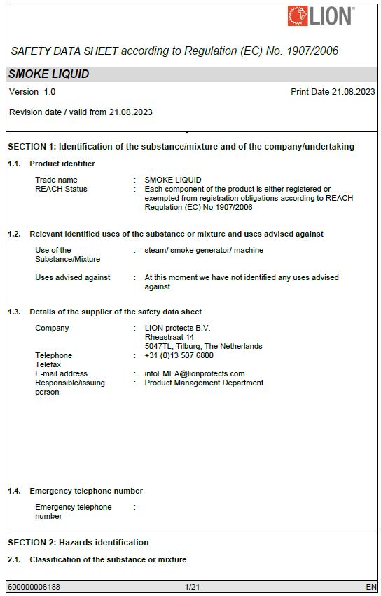 The following pages present an extract of the Safety Data Sheet for the smoke liquid of LION. For the full version, please contact LION TotalCare.