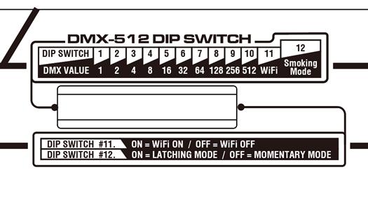 DIP# 1 to 10 for setting DMX address DIP# 11 for switching Wi-Fi on and off DIP# 12 for switching the push button's modes