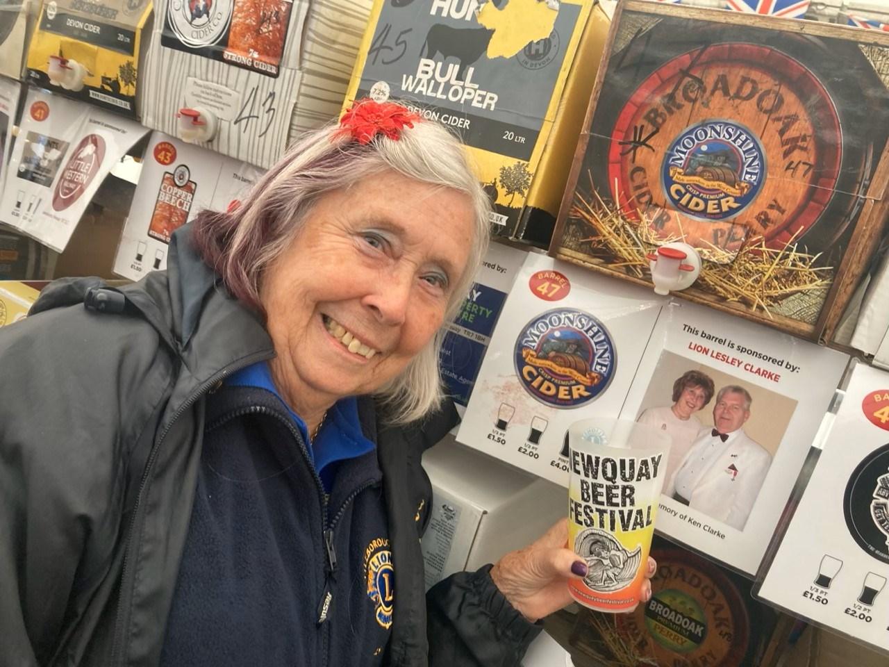PDG Lion Lesley Clarke alongside one of the barrels she has sponsored over the past ten years of Newquay Beer Festival