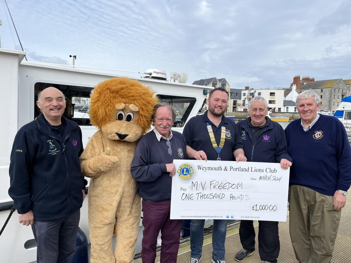 Following on from the presentation to Home-Start Wessex, the Lions paid a visit to North Quay pontoon where M.V.Freedom is moored to present another bumper cheque for £1,000. This donation will help them to purchase much-needed safety equipment. Staffed entirely by volunteers with all expenses paid for by generous donations, M.V.Freedom is a specially adapted boat which carries disabled adults and youngsters with carers on boat trips from Weymouth.
