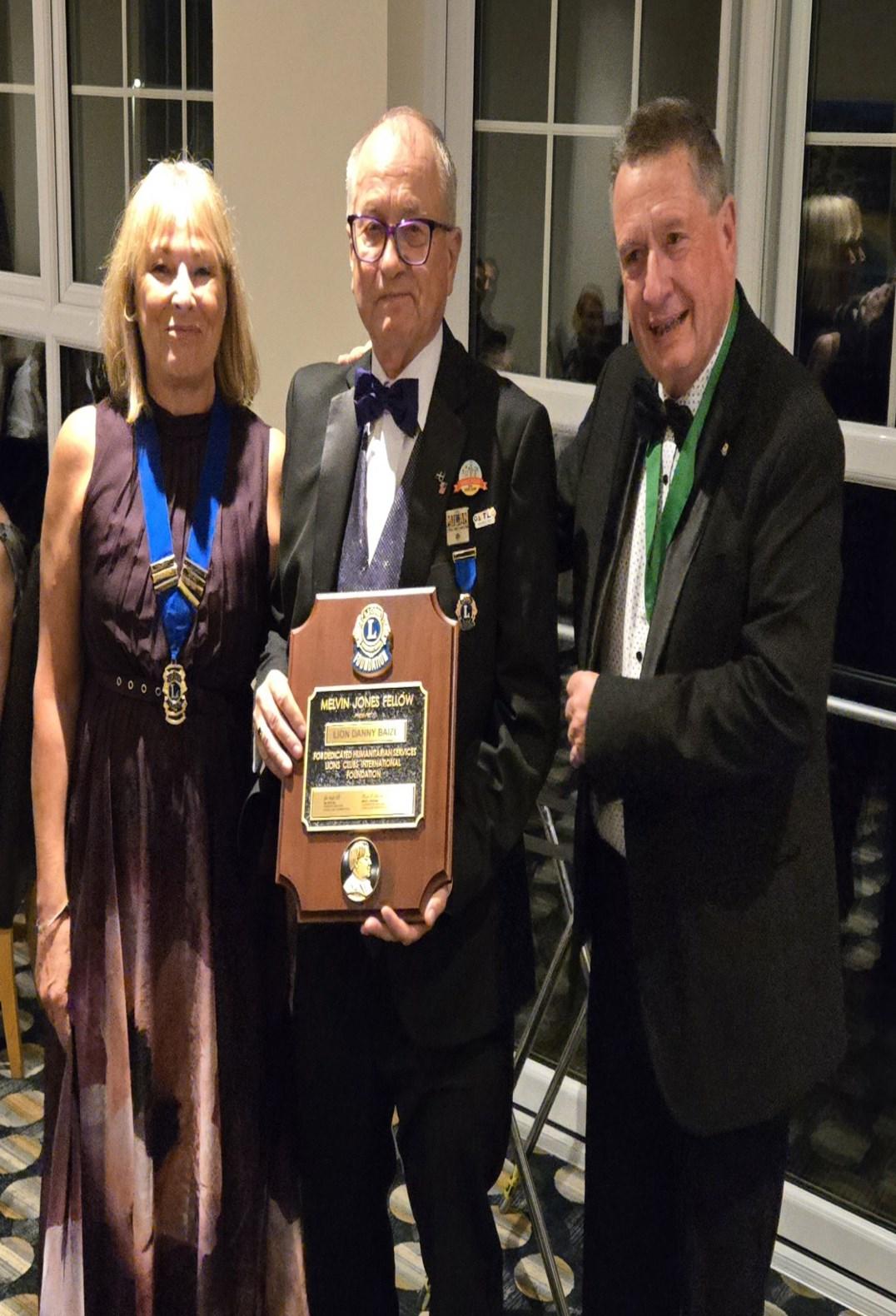 Lion Danny Baize of Newquay Towan Blystra Lions Club was surprised during the club’s 16th Charter Anniversary celebrations at The Pentire Hotel, Newquay, when Lion President Heather Stanley invited 2nd VDG Phil Bunt to join her in presenting Danny with an MJF for the part he has played in the club over many years.
