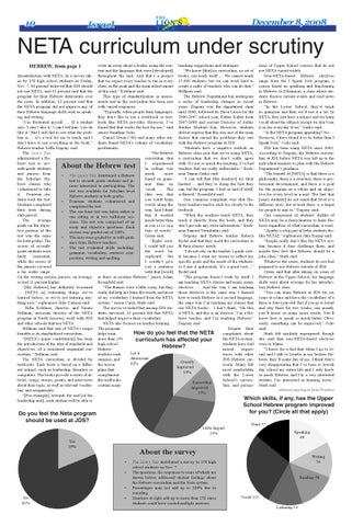 write an essay about a leader, using the con- teaching suggestions and strategies. tions of Upper School courses that do not tent and the language that were [developed] “We know [that] no curriculum, no set of use NETA varied widely. dissatisfaction with NETA. In a survey tak- throughout the unit. And that’s a project books, can teach itself .... We cannot teach Non-NETA-based Hebrew electives en by 258 high school students on Friday, that we expect every teacher to run in every 15,000 students, but we can work hard to range from the I Speak Ivrit program, a Nov. 7, 81 percent believed that JDS should class, as the peak and the main achievement create a cadre of teachers who can do that,” course based on speaking and functioning not use NETA, and 42 percent said that the of this unit,” Kobliner said. Stillman said. in Hebrew, to Dilemmas, a class where stuprogram let their Hebrew deteriorate over This type of standardization in assessThe Hebrew Department has undergone dents discuss current events and read news the years. In addition, 22 percent said that ments and in the curriculum has been met a series of leadership changes in recent in Hebrew. the NETA program did not improve any of with varied responses. years. Dagony was the department chair “In the Lower School, they’d teach their Hebrew language skills such as speak“Typically, when people learn languages, until 2006, followed by Hava Lurya for the us grammar and then we’d use it a lot. In ing and writing. they don’t like to use a workbook or text- 2006-2007 school year, Esther Kalter from NETA, they just have a subject and we learn “I’m frustrated myself …. If a student book like NETA provides. However, I’ve 2007-2008 and current Director of Judaic vocab about the subject, except we don’t use says ‘I don’t like it,’ I can’t tell him ‘you do found that that works the best for me,” said Studies Michael Kay. However, students it in our everyday lives,” Gasko said. like it.’ But I still fail to see what the prob- senior Jonathan Ochs. did not express that this was one of the main “Is the NETA program appealing? No .... lem is … it’s a tool for me to teach, and I Daniel Green (’06) and many other stu- factors that caused the problems they saw However, I have found it to be better than I don’t have to use everything in the book,” dents found NETA’s volume of vocabulary with the Hebrew program at JDS. Speak Ivrit,” Ochs said. Hebrew teacher Yaffa Dagony said. problematic. “Students have a negative outlook on JDS has been using NETA since 2002. The Lion’s Tale “The Hebrew Hebrew class now that we’re using NETA, According to Dagony, the Hebrew curricuadministered a Hecurriculum that a curriculum that we don’t really agree lum at JDS before NETA was left up to the brew test to sevI experienced with. It’s not so much the teaching. I’ve had individual teachers to plan with the Hebrew enth-grade students in college was teachers that are really enthusiastic,” fresh- Department’s guidance. and juniors from much more man Tamar Gasko said. “The benefit of [NETA] is that there is a • The Lion’s Tale distributed a Hebrew the Scholars Hebased on gram“I can tell that [the teachers] try their philosophy, there is a structure, there is protest to seventh grade students and jubrew classes who mar than on hardest ... and they’re doing the best they fessional development, and there is a goal niors interested in participating. The volunteered to take vocab .... The can, but the program, I feel, in and of itself, for the program as a whole and an objectest was available for Scholars level it. Fourteen stuidea was that is flawed,” Rosenfeld said. tive for every level in a unit. The fact that Hebrew students in both grades. dents took the test. you could learn One common complaint was that He[some students] do not reach that level is a • Fourteen students volunteered and Students completed words along the brew teachers tend to stick too closely to the different story, but at least there is a target completed the test. their tests during way. And I think textbook. for people to aim to,” Dagony said. • The one hour test was taken either in club period. that it worked “When the teachers teach NETA, they One component of students’ dislike of one sitting or in two half-hour sesThe average much better than teach it directly from the book, and they NETA may be a disinclination to learn Hesions. The test was comprised of an grade on the objecm e m o r i z i n g don’t provide any extra information,” freshbrew regardless of what curriculum is used. essay and objective questions. Each tive portion of the lists of words,” man Samuel Yerushalmi said. “Apathy’s a big part of [why students dissection was graded out of 100%. test was the same Green said. Dagony and Hebrew teacher Rebeca like NETA],” sophomore Jake Romm said. • The tests were graded by or with guidfor both grades. The “Right now, Rydel said that they mold the curriculum to “People really don’t like the NETA sysance from Hebrew teachers. scores of seventhI could tell you fit their classes’ needs. tem because it does challenge them, and • The test evaluated skills including: grade students were the word for “I do not rely on the teacher’s guide solemaybe they feel like Hebrew should be a grammar, vocabulary, sentence comfairly consistent, cupboard, but ly because I want my lesson to reflect my joke class,” Stark said. position, writing and spelling. while the scores of I couldn’t give specific goals and the needs of the students, Whatever the cause, students do not feel the juniors covered you a sentence so I use it judiciously. It’s a great tool...,” prepared to use Hebrew outside of JDS. a far wider range. with that [word] Rydel said. Green said that after taking six years of On the writing section, juniors, on average, in there in modern Hebrew,” junior Adam “The program 