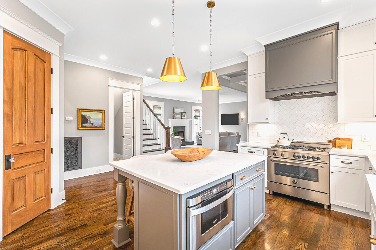 Truly built for a chef, this kitchen is sure to captivate your desires for dreamy living The cool gray tones throughout the space balance the warmth of the hardwood floors. Antique brass finishes and fixtures flawlessly accentuate this kitchen’s modern stainless steel appliances