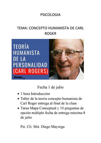 Fecha 1 de julio • 1 hora Introducción • Taller de la teoría concepto humanista de Carl Roger entrega al final de la clase • Tarea Mapa Conceptual y 10 preguntas de opción múltiple fecha de entrega máxima 8 de julio Psi. Cli. Mst. Diego Mayorga