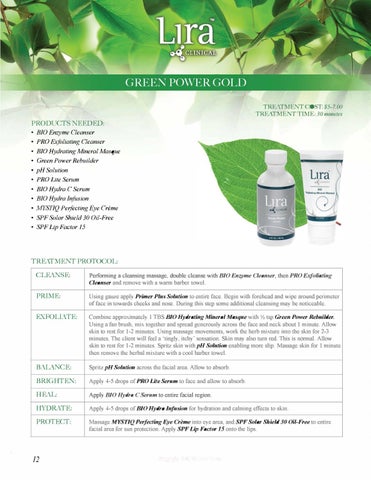 PRODUCTS NEEDED: • BIO Enzyme Cleanser • PRO Exfoliating Cleanser • BIO Hydrating Mineral Masque • Green Power Rebuilder • pH Solution • PRO Lite Serum • BIO Hydra C Serum • BIO Hydra Infusion • MYSTIQ Perfecting Eye Creme • SPF Solar Shield 30 Oil-Free • SPF Lip Factor 15