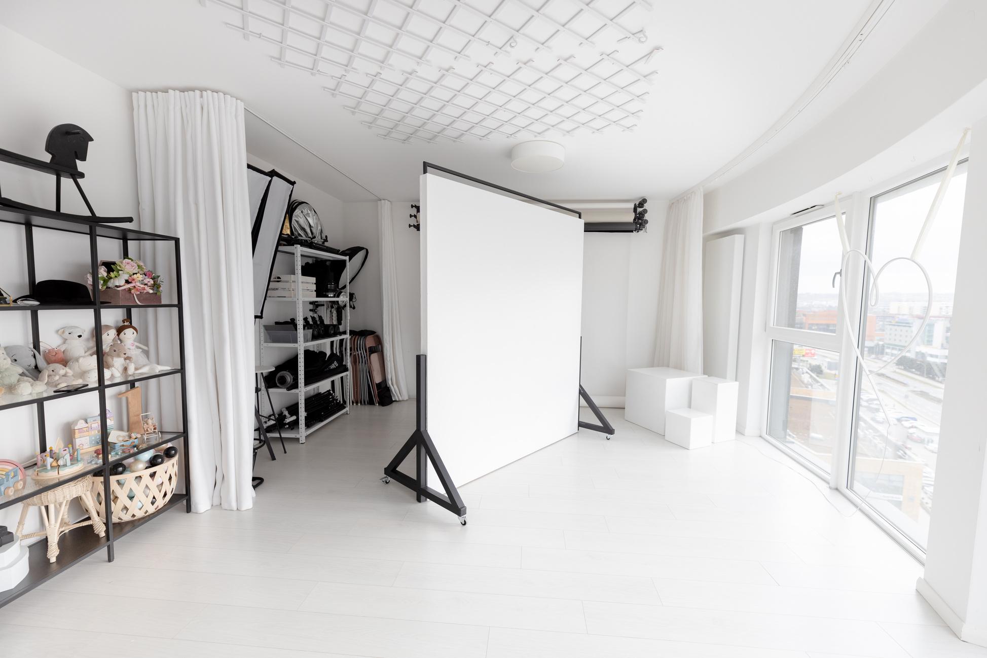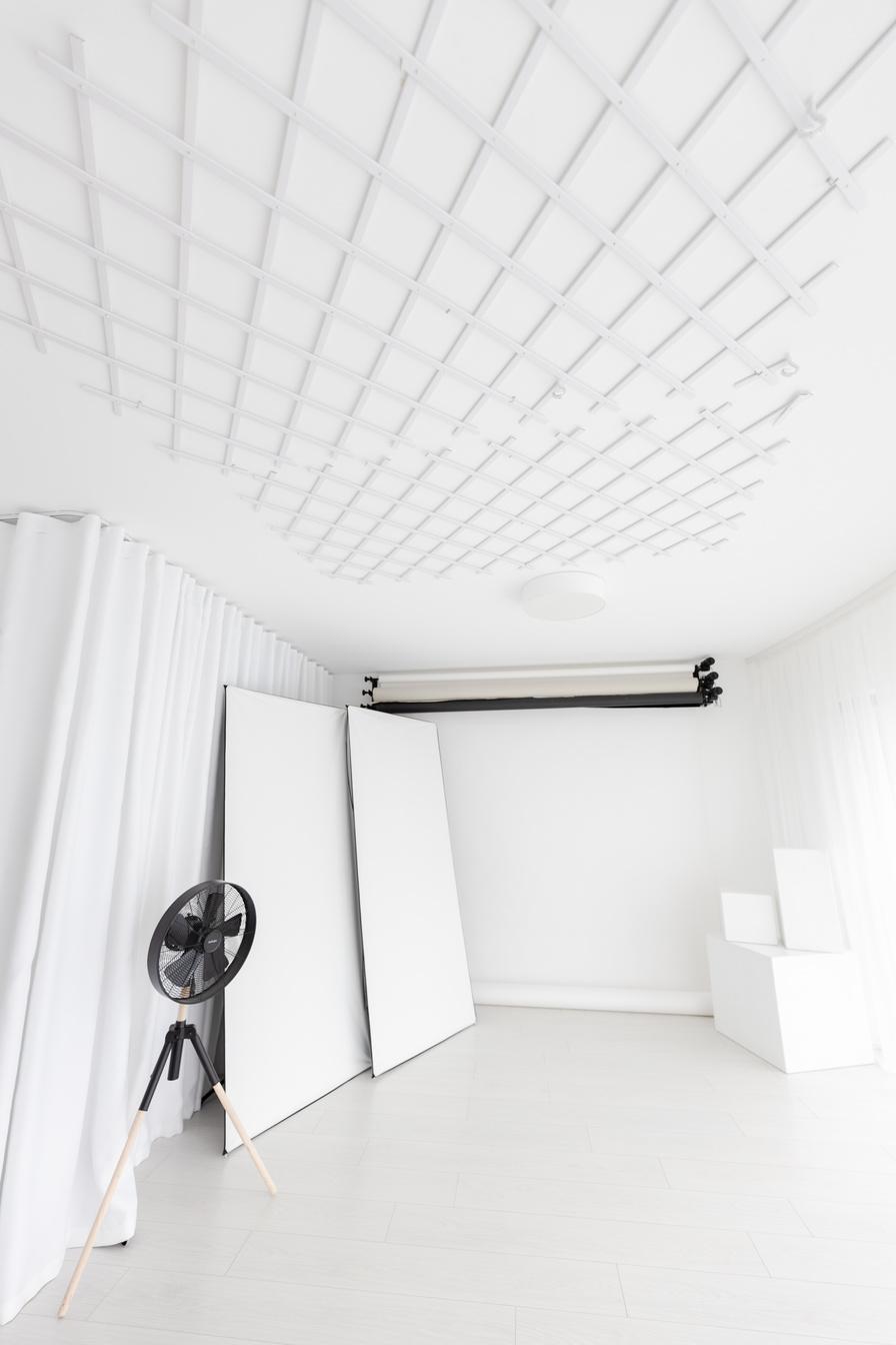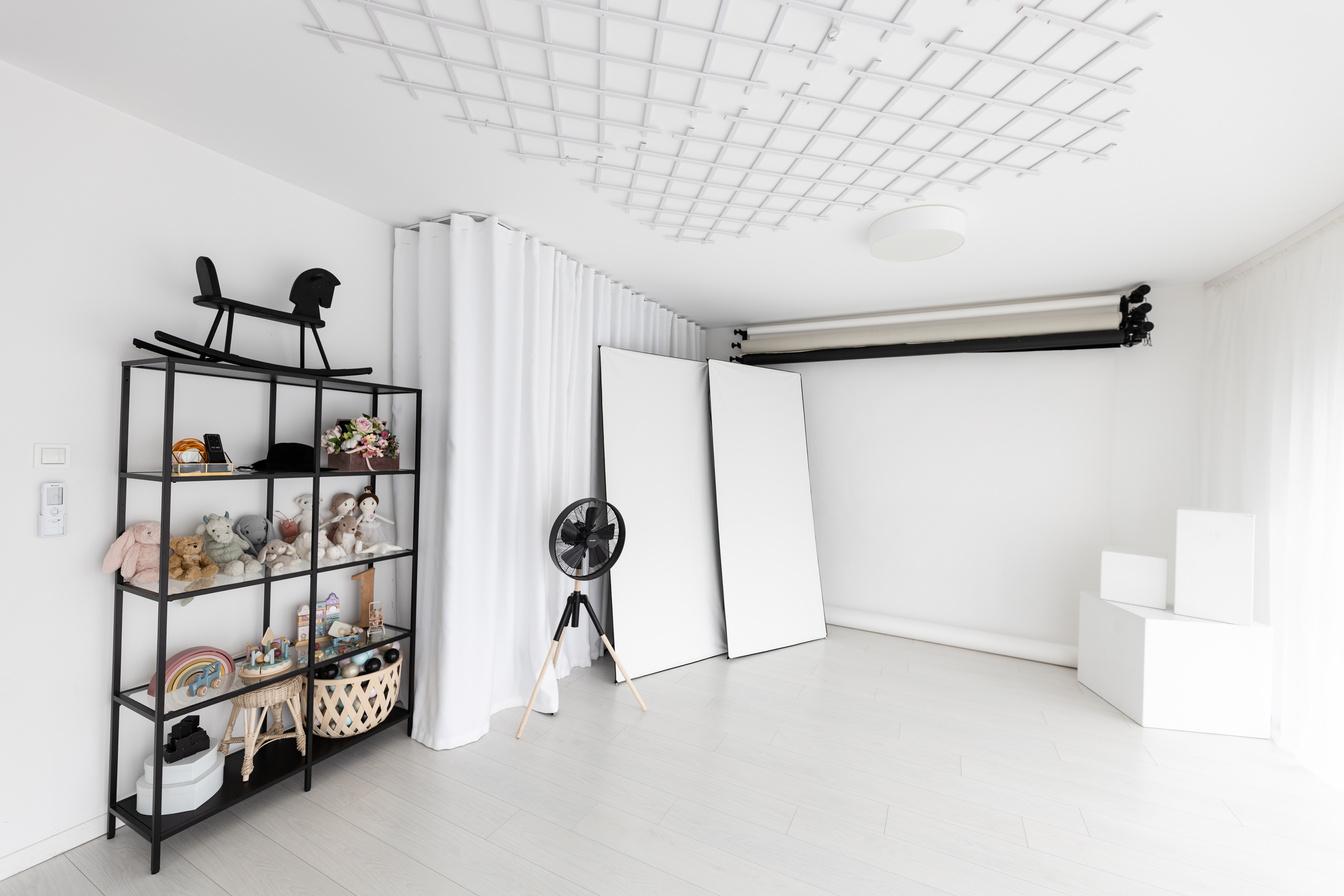 Przestrzeń fotograficzna z systemem podwieszania teł, sztukaterią oraz wydzielonym zasłonami zapleczem ze sprzętem studyjnym. Na suficie: 5 haków do zawieszania huśtawek, opcja założenia rurek na materiały oraz możliwość instalacji lekkich dekoracji na kratce 2 m x 2 m.