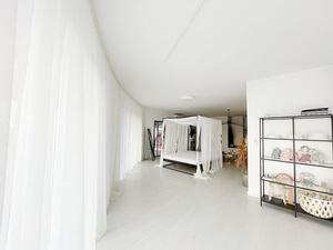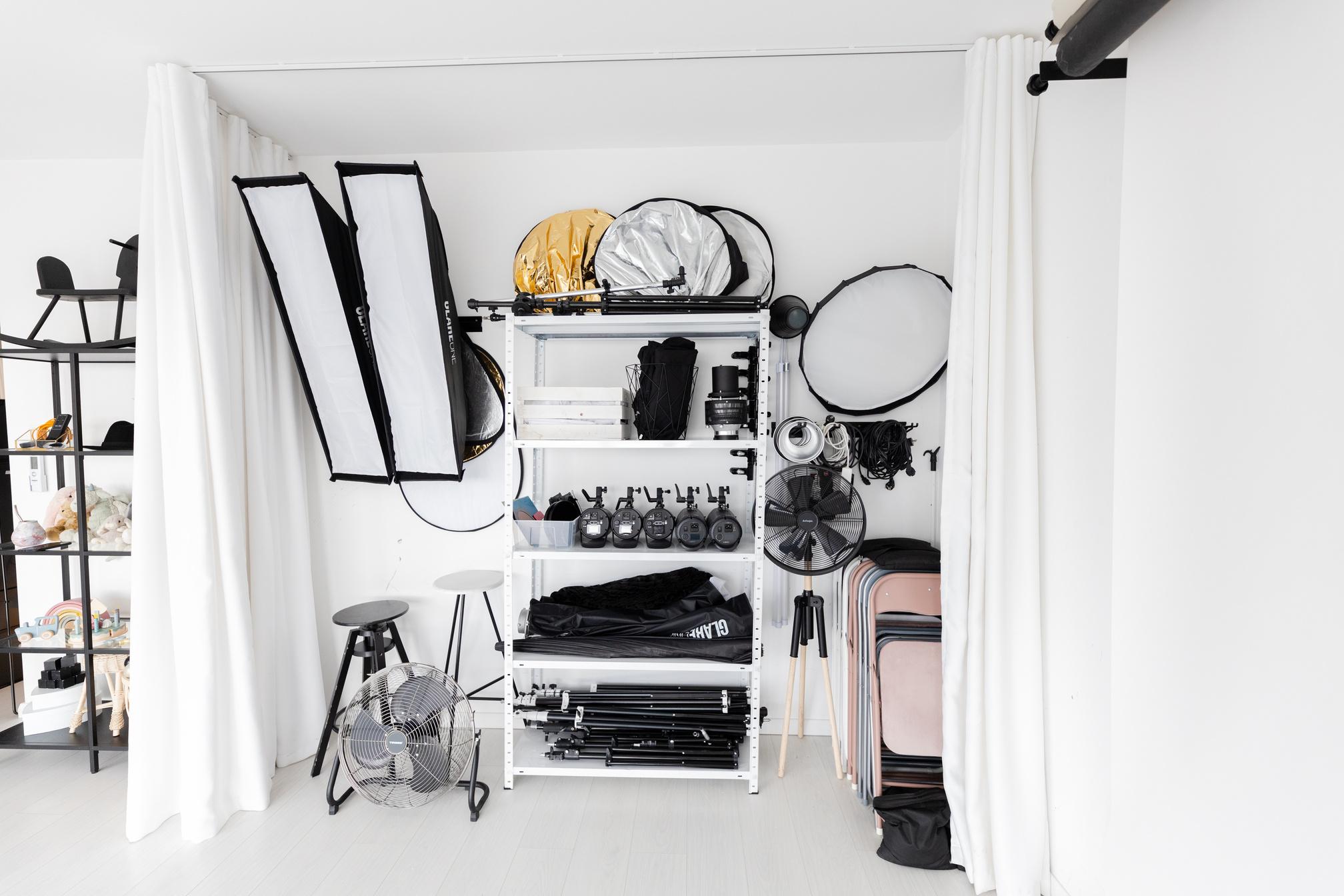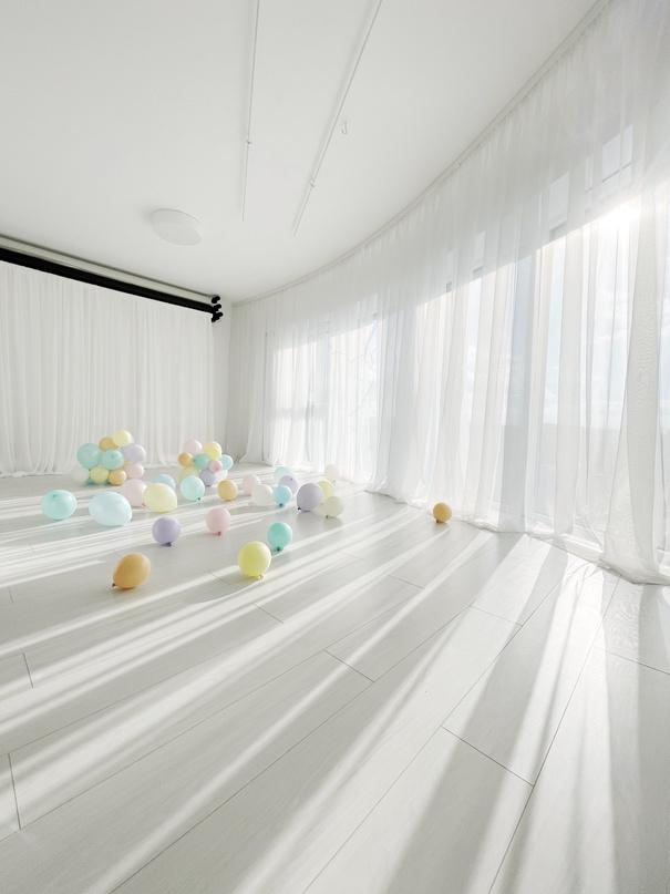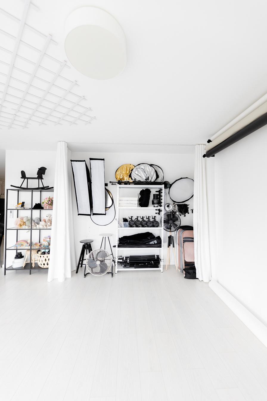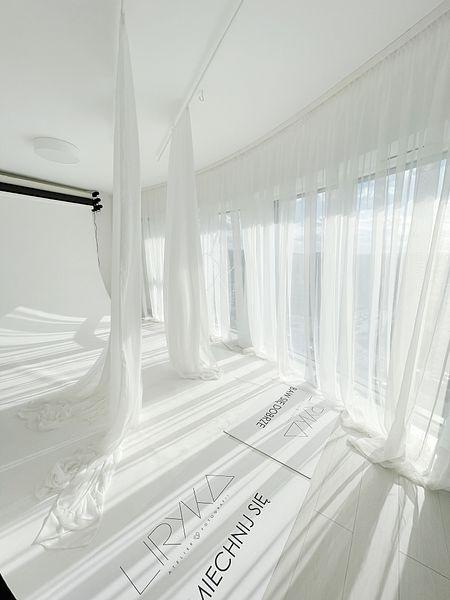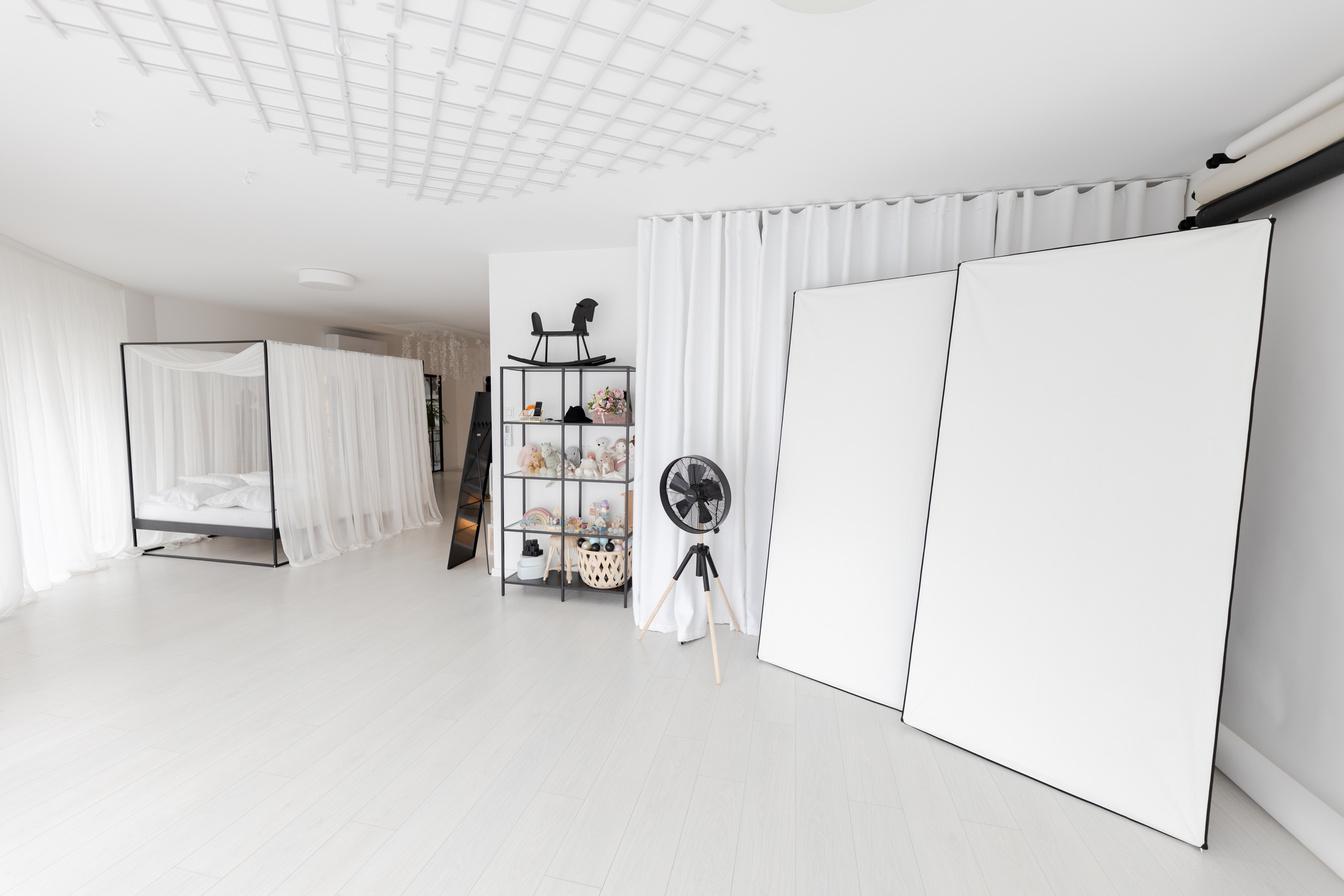 Przestrzeń fotograficzna z systemem podwieszania teł, sztukaterią oraz wydzielonym zasłonami zapleczem ze sprzętem studyjnym. Na suficie: 5 haków do zawieszania huśtawek, opcja założenia rurek na materiały oraz możliwość instalacji lekkich dekoracji na kratce 2 m x 2 m.