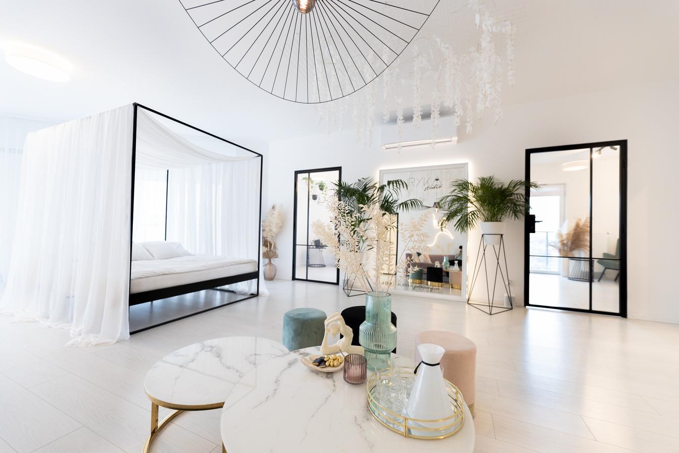 Otwarta przestrzeń wypoczynkowa ze stolikami, łóżkiem z baldachimem, dużym lustrem i palmami.