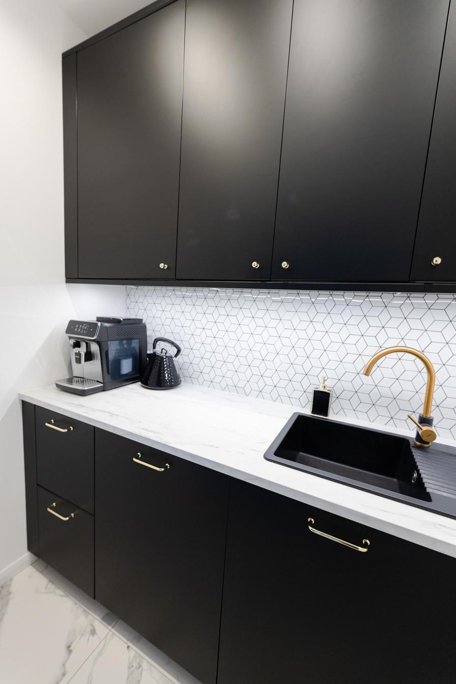 Aneks kuchenny z ekspresem do kawy, lodówką, mikrofalówką, dzbankiem filtrującym wodę, zawierający także szklanki, filiżanki, kieliszki, sztućce, patery cateringowe, jednorazowe talerze, sztućce i kubki.