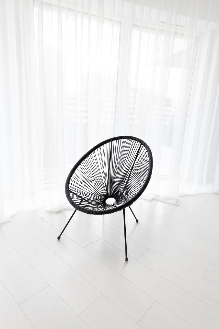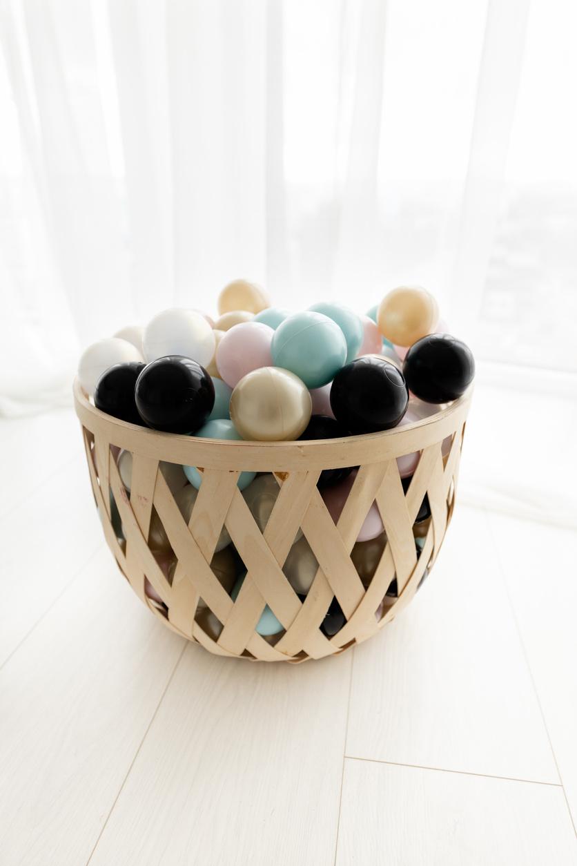 100 pastelowych kulek do suchego basenu, czarny konik na biegunach, taborecik wiklinowy