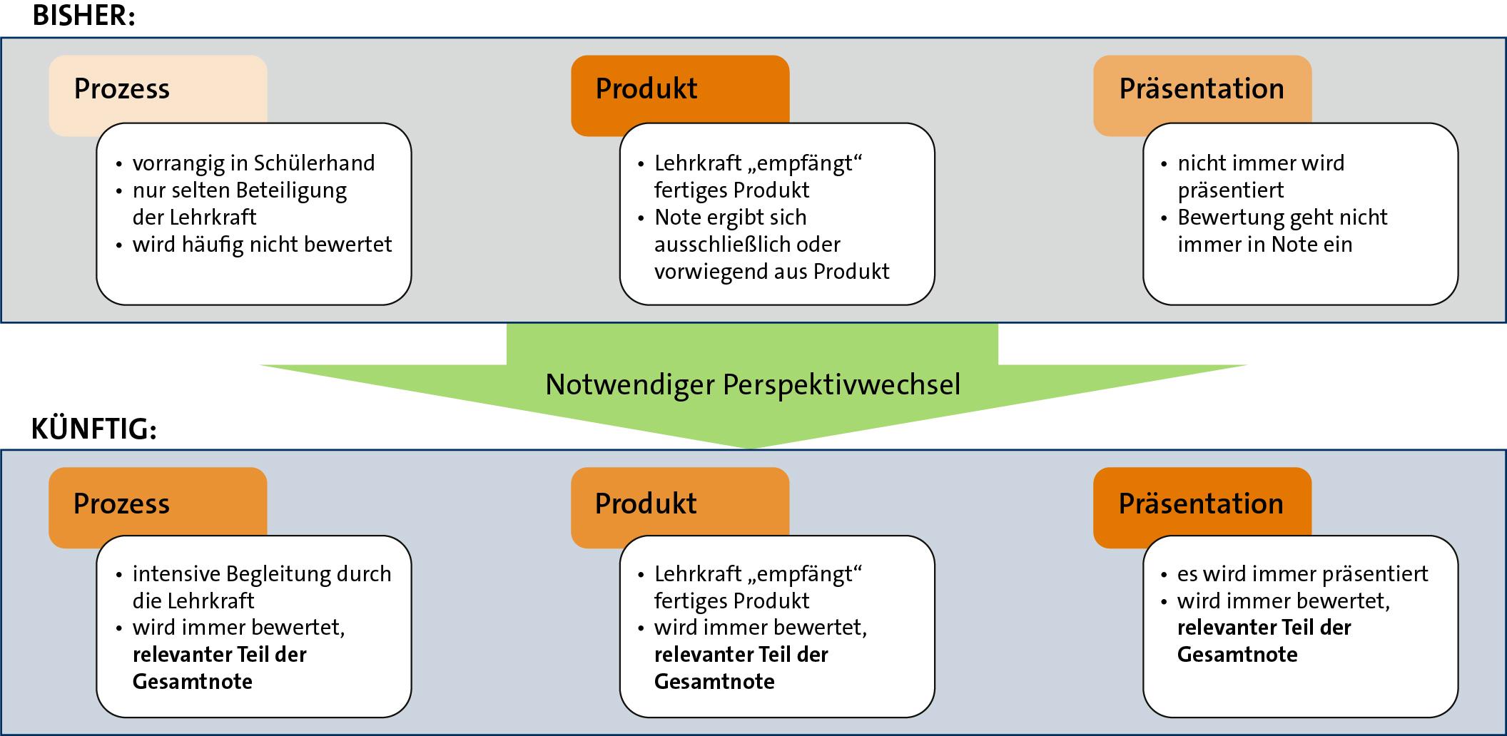 Schwerpunkte der prozessbegleitenden Bewertung sind das methodische Vorgehen und die inhaltliche Auseinandersetzung unter Verwendung verschiedener Quellen durch die Lernenden. Dadurch kann zudem bereits im Arbeitsprozess sichergestellt werden, dass die genutzten Hilfs-