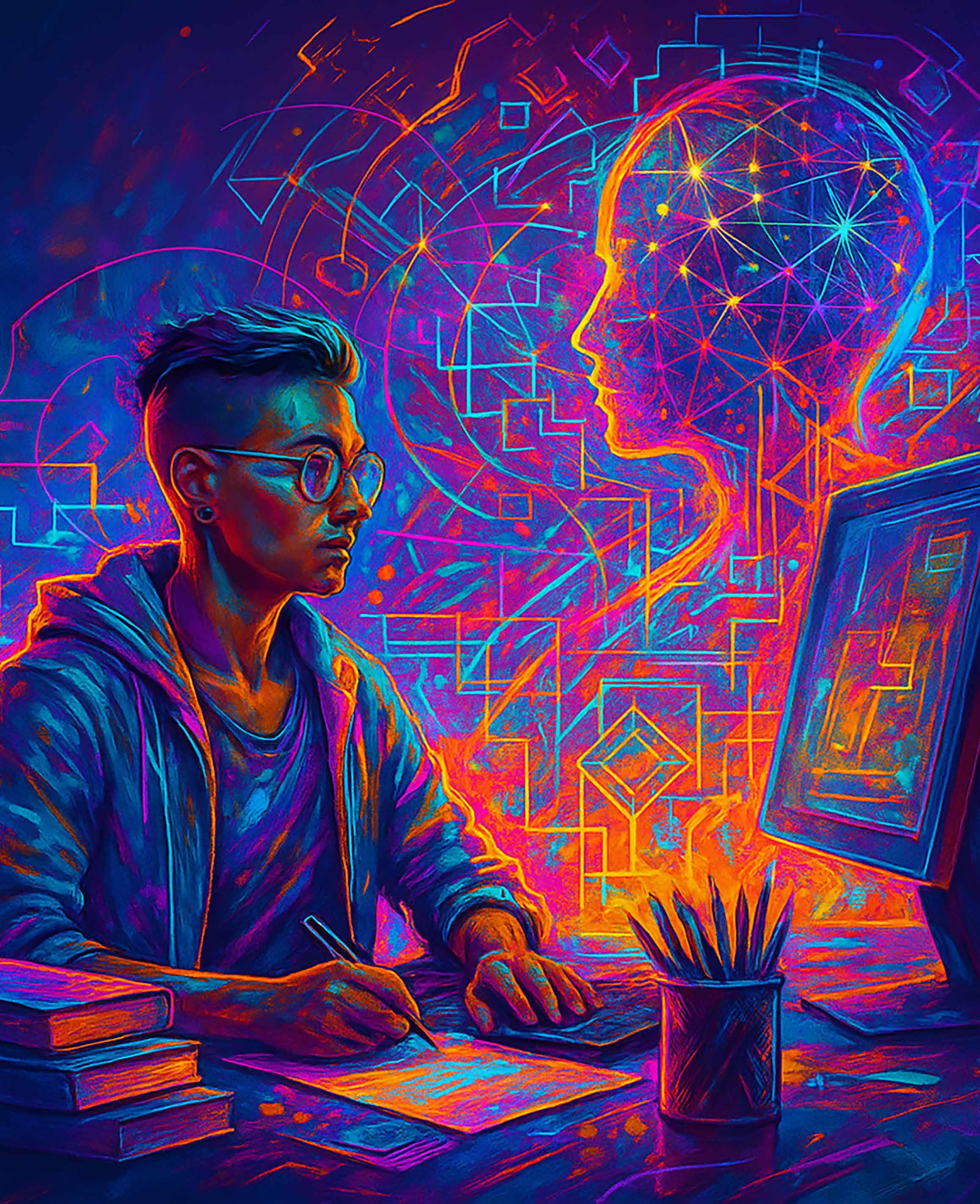 DALL·E 3 & ChatGPT (GPT-4o) (2025): Junger Mensch nutzt Computer, Bücher und Künstliche Intelligenz für Arbeit [KI-generiertes Bild]. CC BY-SA