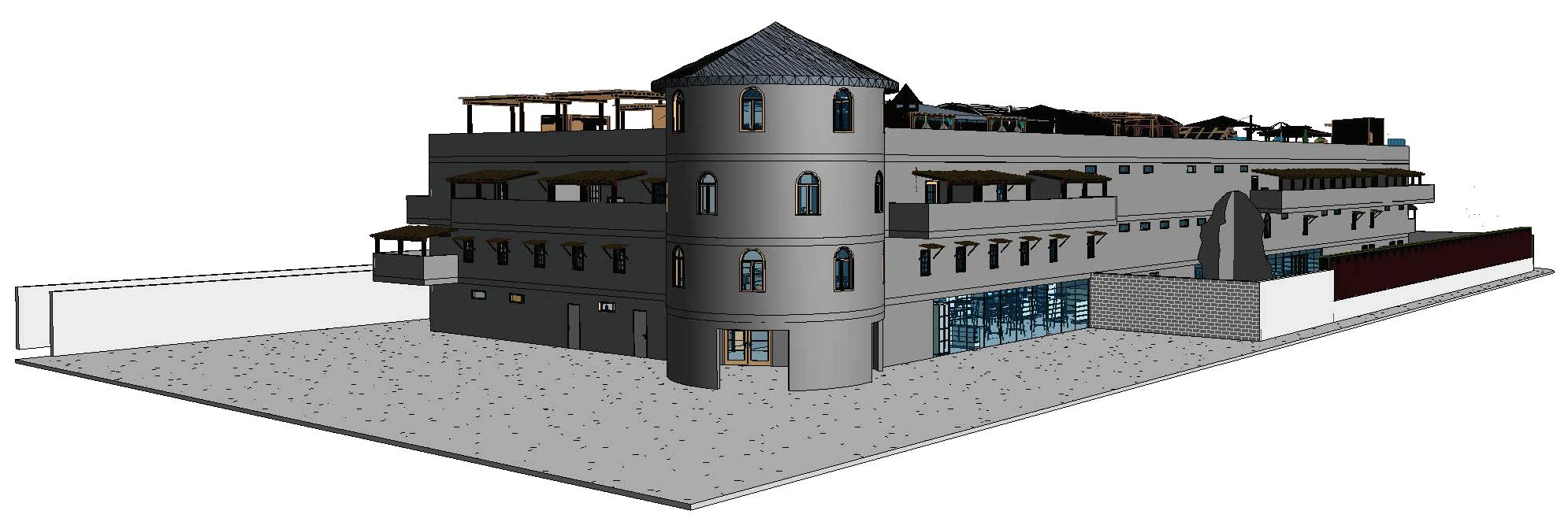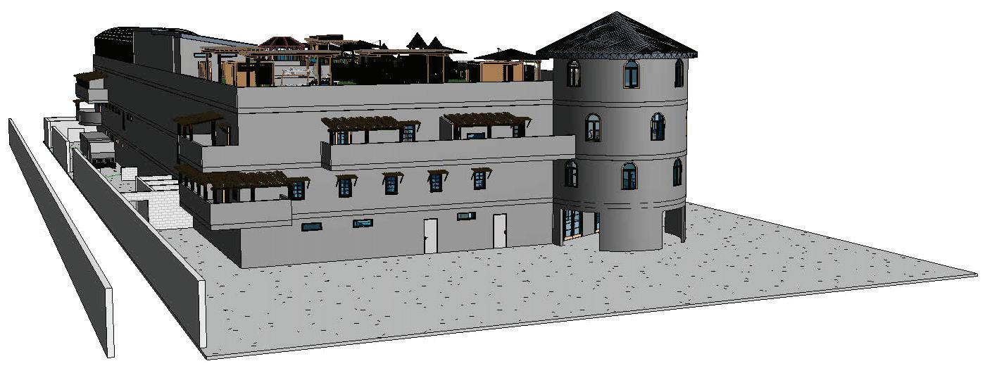 The building covers about 24,050 square feet of the near 50,600 square foot property. It includes four floors (including the ground floor and roof top terrace), with the second and third floors as the living quarters for the residents.