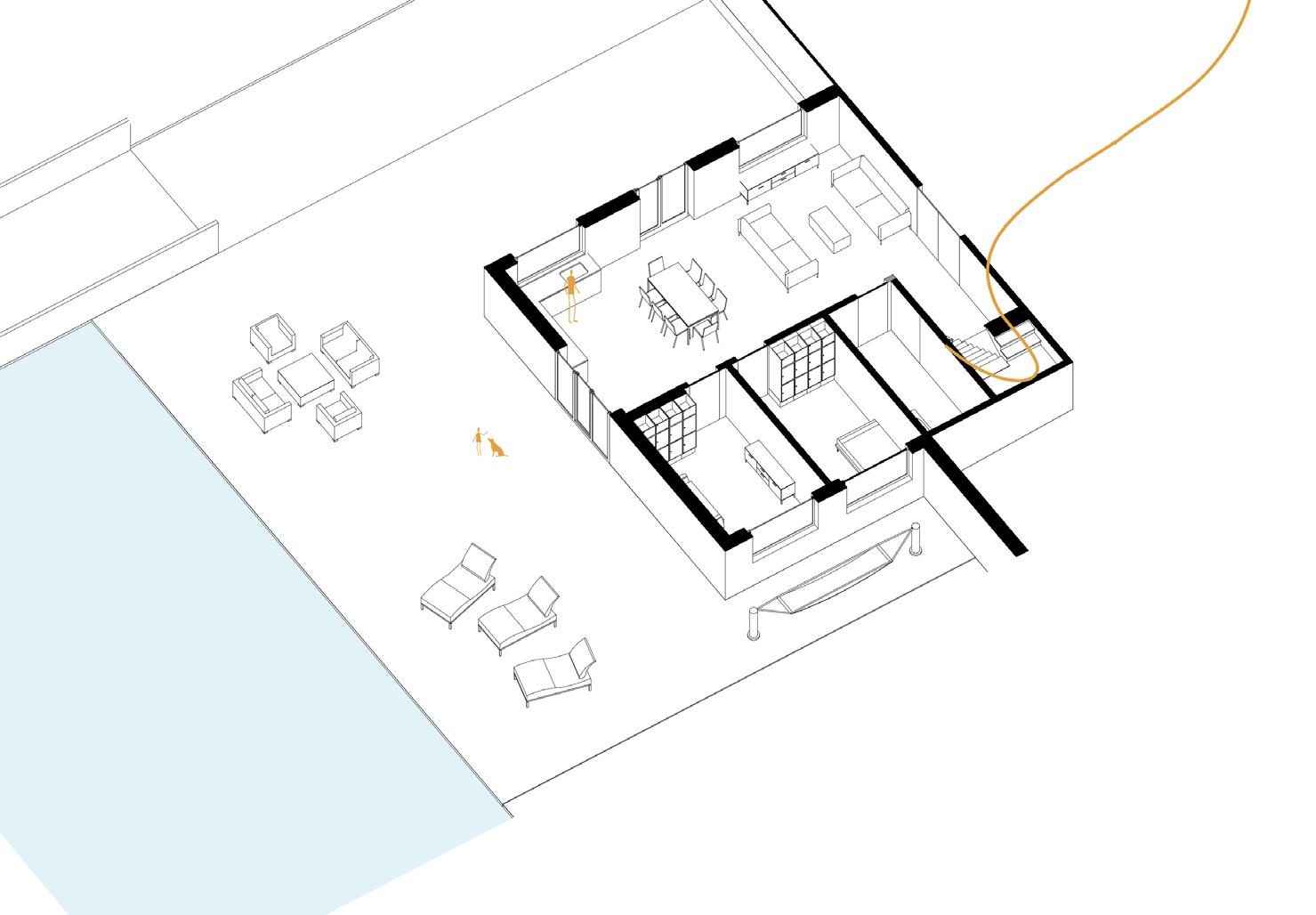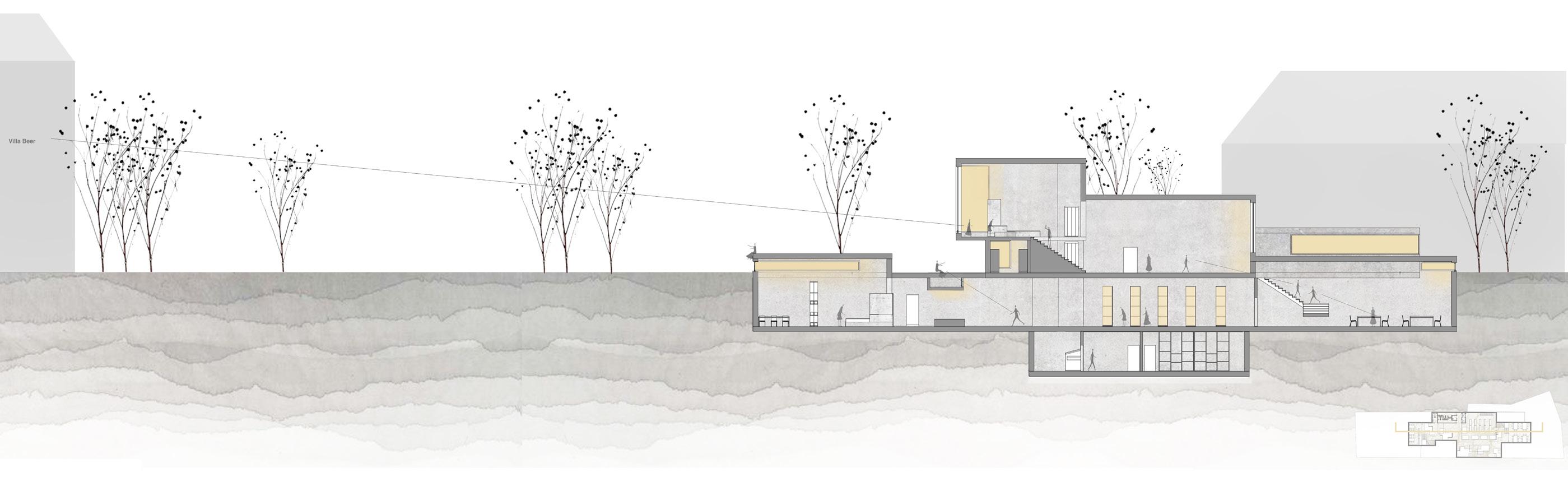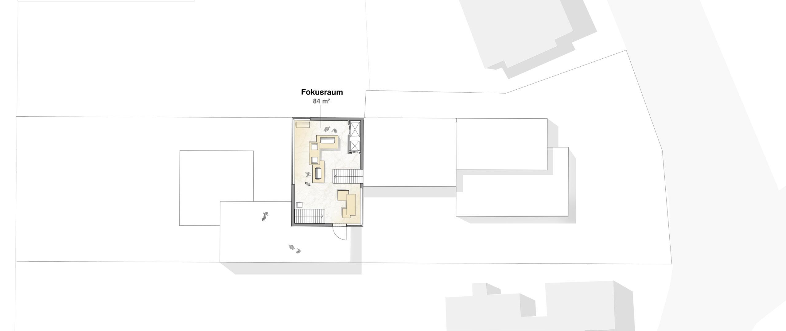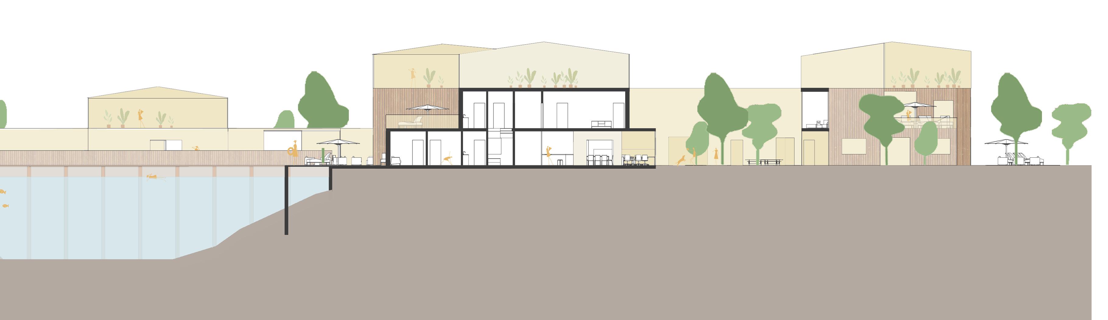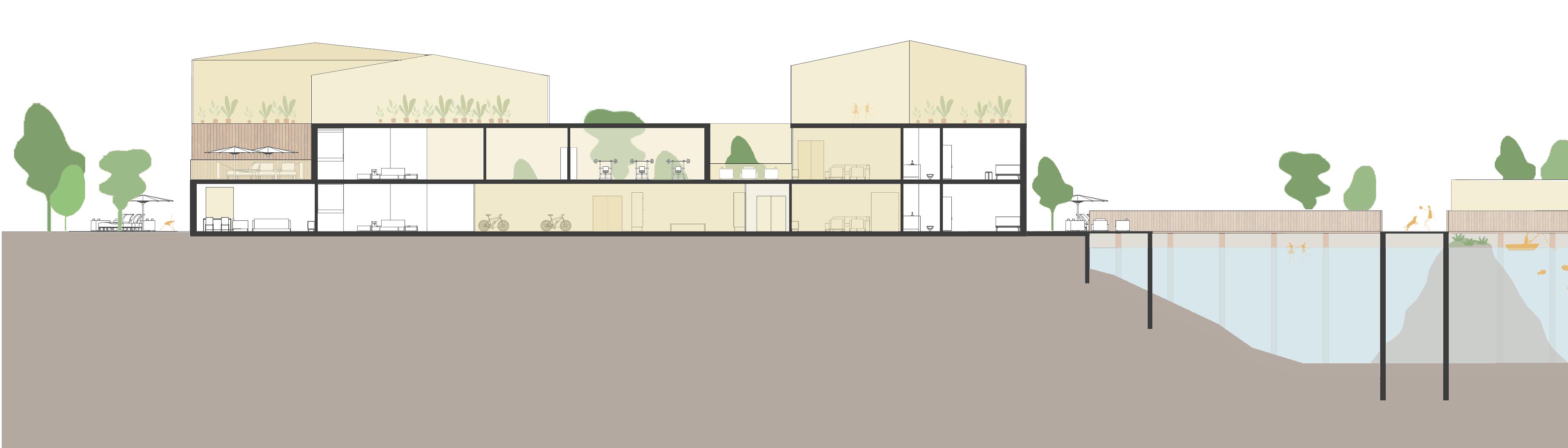 Der Pufferraum ist ein offener Bereich zum Entspannen, mit Vegetation und Sitzmöglichkeiten. Von diesem Bereich kragen Terrasen teilweise aus und erzeugen Blickbeziehungen.