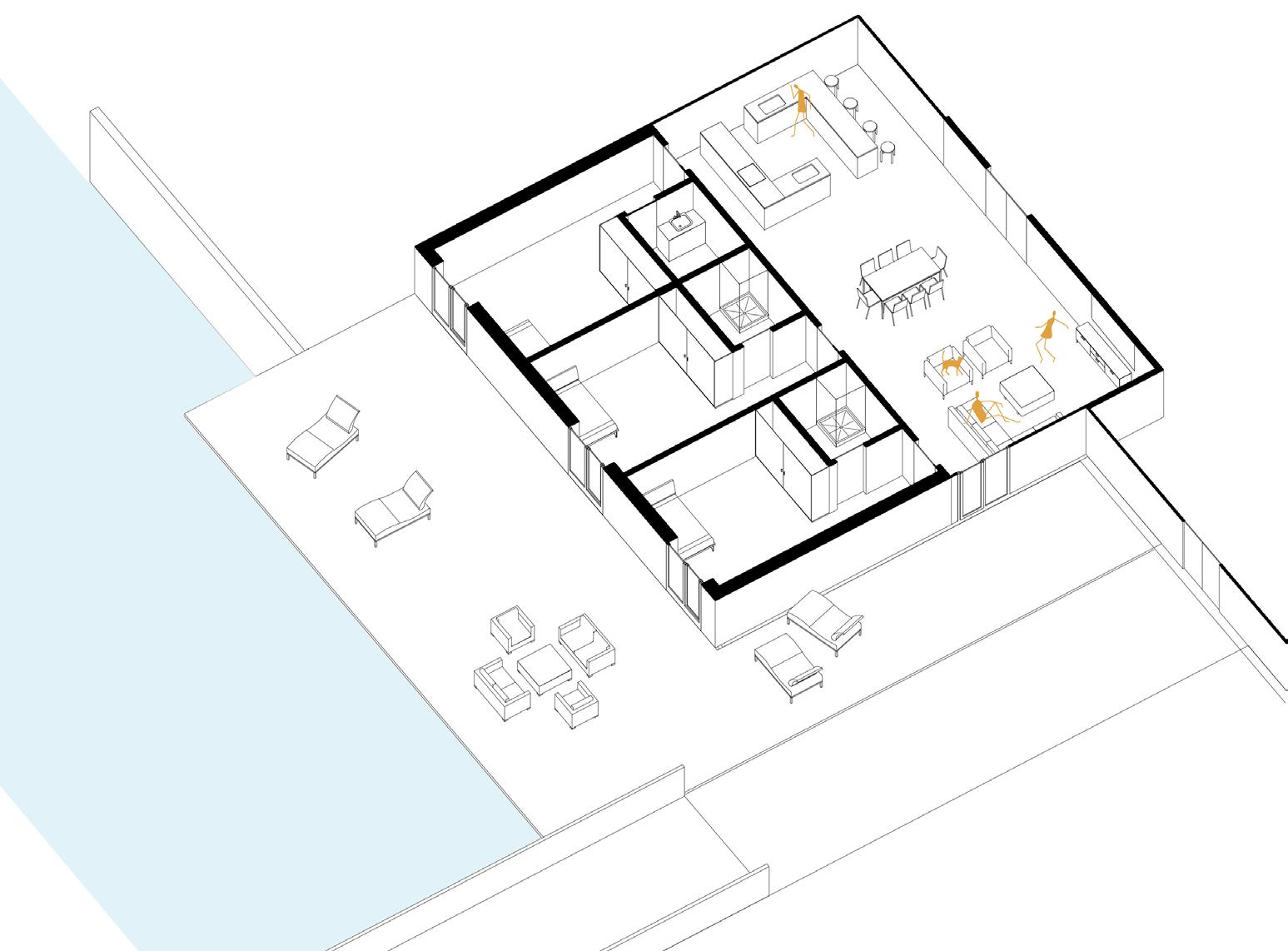 Raumabfolge als Spiel mit verschiedenen Raumgrößen und Niveauunterschiede, Belichtung in den Ecken der Räume durch Eckverglasungen