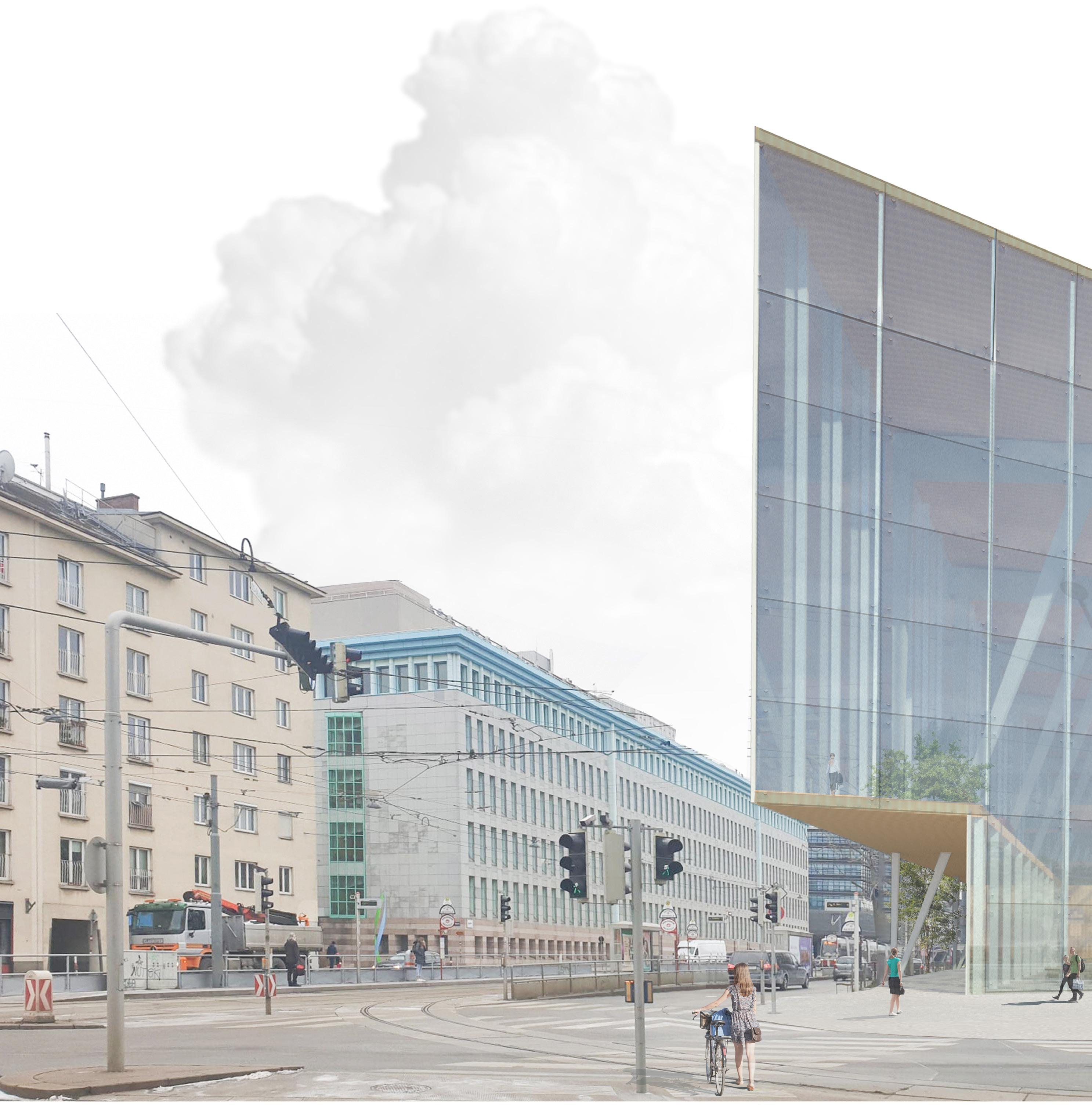 ‘‘Vertikale Schlösser’’ folgen der Topografie und nehmen vom Schloss Neugebäude linear in Höhe zu, in Richtung der bestehenden Wohnabauten