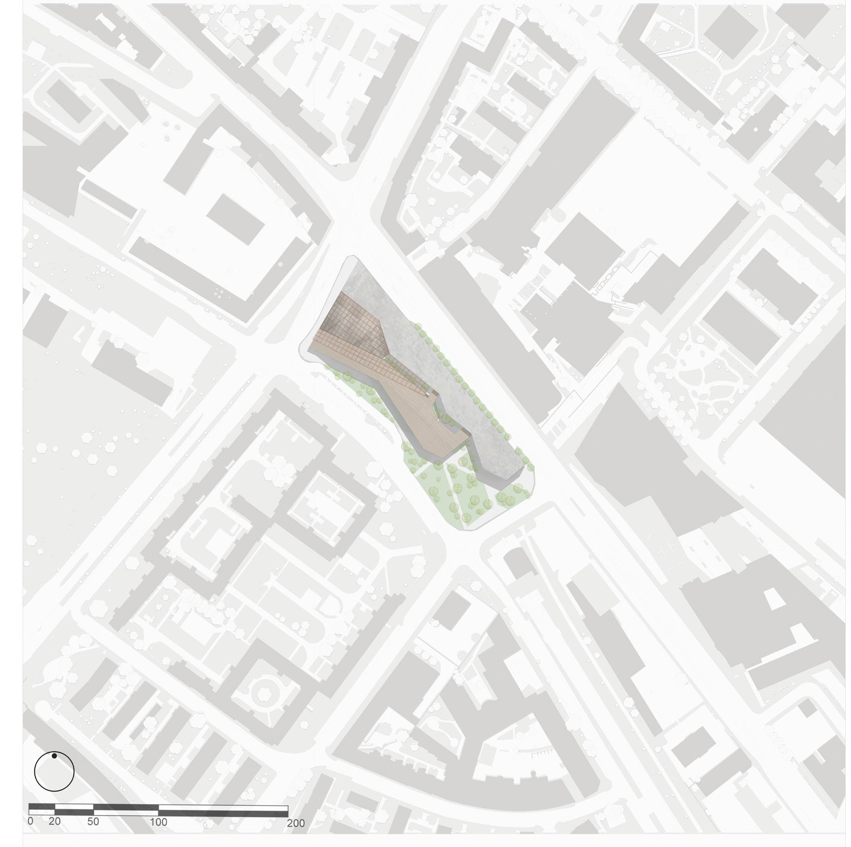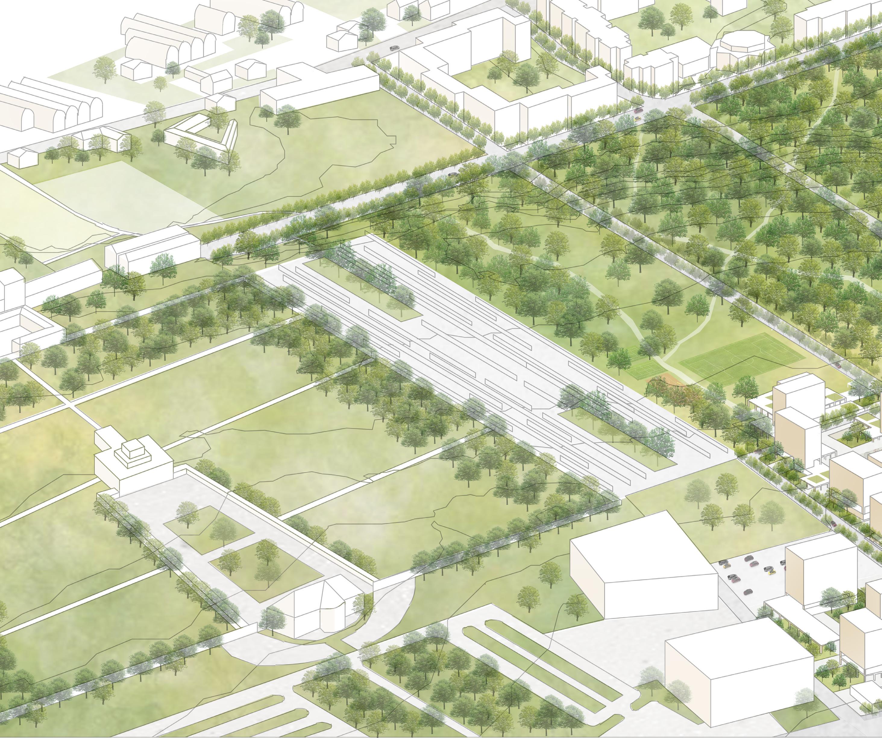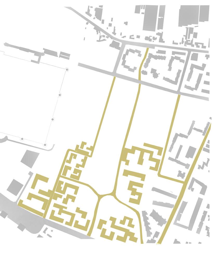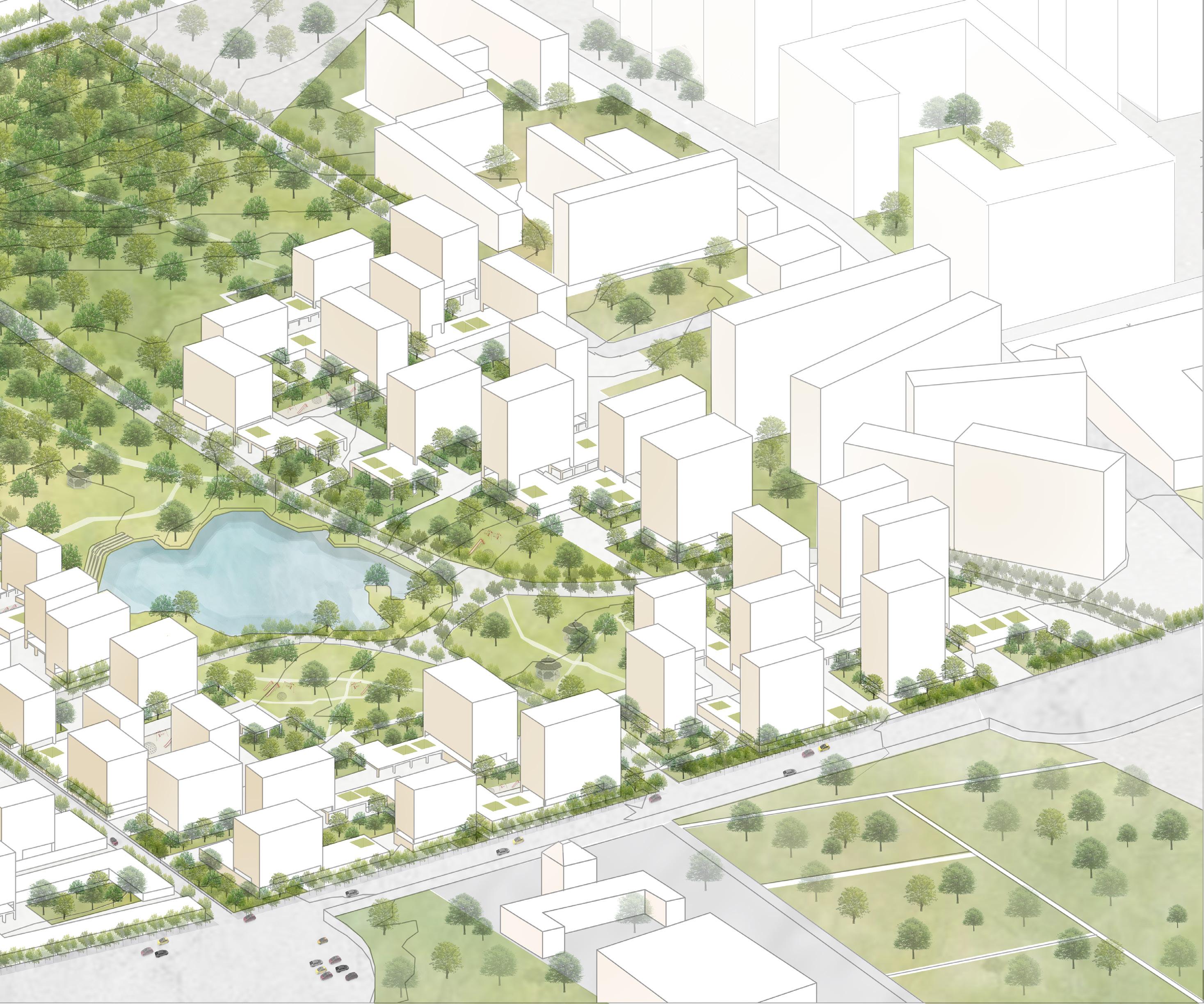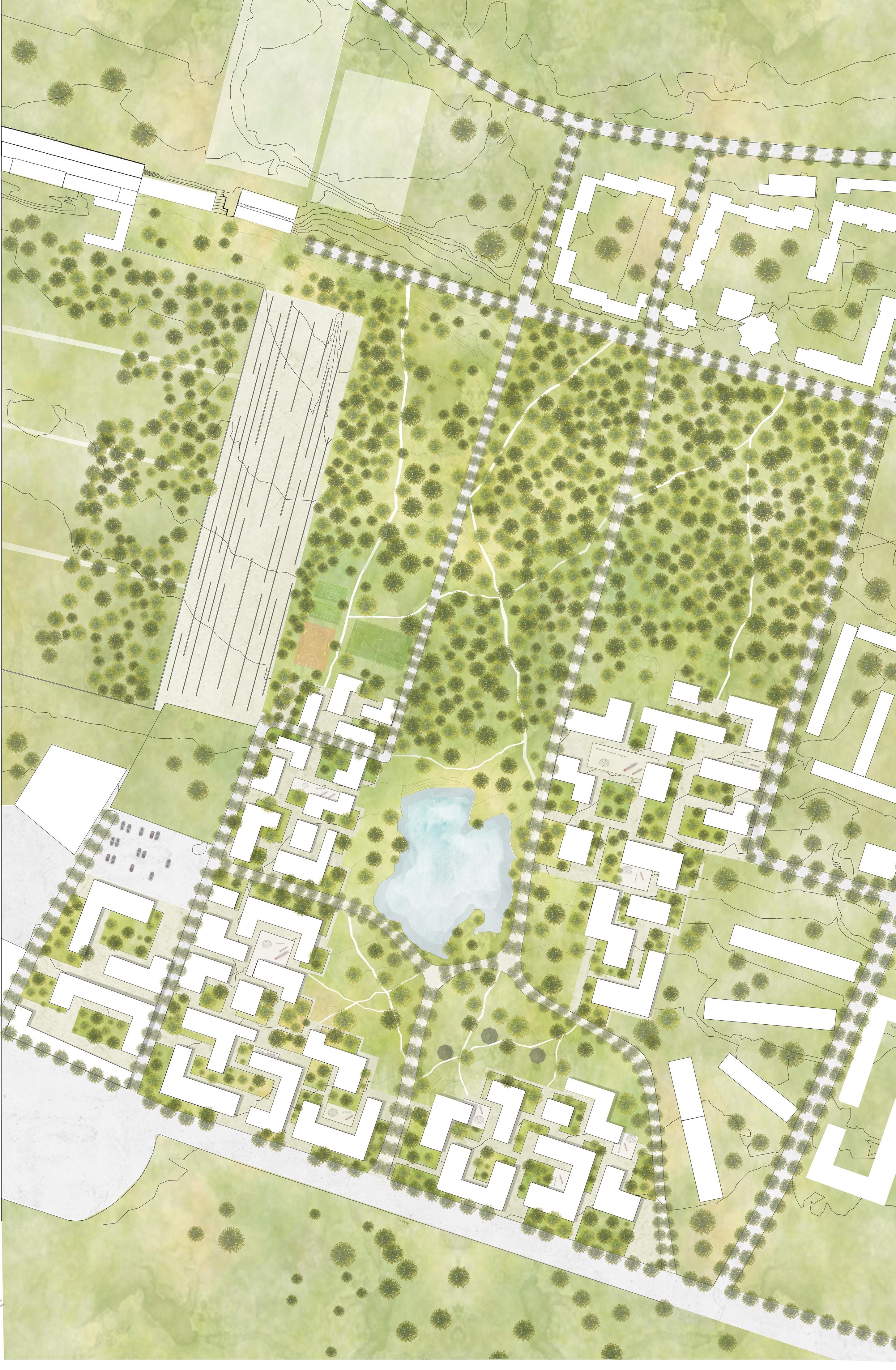 Die Lücke zwischen dem Schloss und den hohen Wohnbauten im Osten sollte als Bauplatz dienen und belebt werden. Sogenannte ‘‘Vertikale Schlösser’’ werden gebaut, die der Topografie folgen und vom Schloss Neugebäude linear in Höhe zunehmen. Wichtig war es, dass der Baugebiet naturverbunden bleibt, deswegen wurde die Bewaldung erweitert. Ein ausgetrockneter ehemalige Teich soll auch aufgefüllt werden.