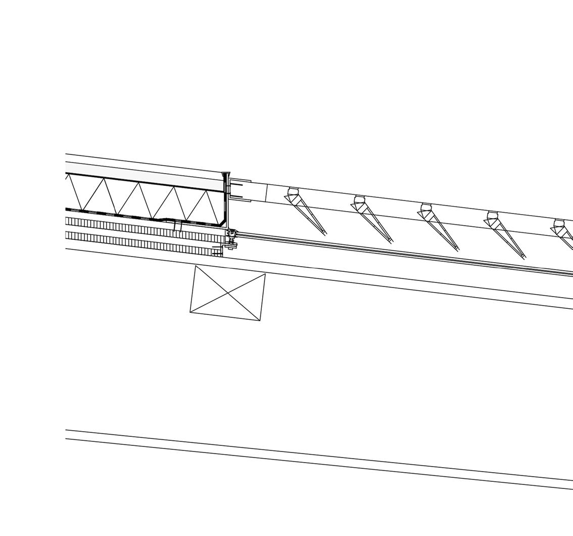 Ein Stahl Rahmen mit gelenkigen Stützen und einen I-Träger tragen das Gebäude. Sie stehen im Abstand von 12 m und haben verschiedene Spannweiten (19 m-52 m).