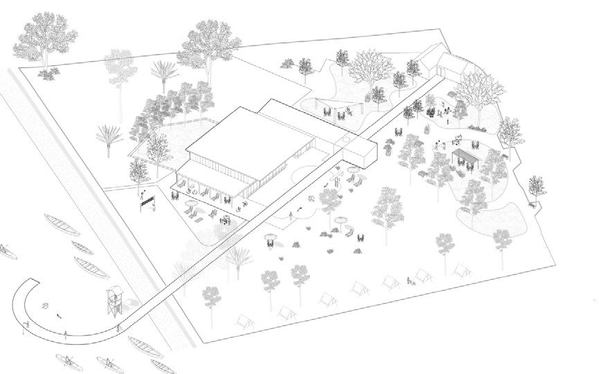 Entréplanet har en öppen lobby med reception, medan övervåningen rymmer mötesrum, personalutrymmen och en scen för evenemang. Utomhusmiljön prioriteras med fokus på gångoch cykelvänlighet, ett stort utomhuspoolområde och en halvcirkelformad brygga för bad och vila.