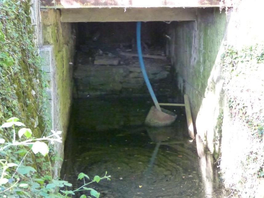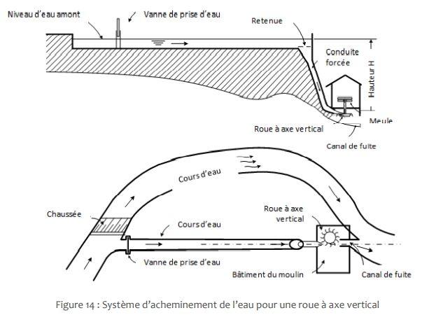 Il existe en amont de la roue une vanne et une retenue (« paissière ») pour contrôler le passage régulier de l’eau. En cas de crue, le déversoir évacue le surplus d’eau affluant dans le lit du ruisseau contournant le moulin. A cela s’ajoute un puits devant l’arche d’entrée de l’eau pour réguler le débit qui comporte un conduit, canon à eau, dont le rôle est de projeter le flux puissant sur le rouet. 15 L’eau poursuit son chemin vers une arche de défuite pour rejoindre le ruisseau en contrebas.16 Le schéma ci-contre illustre le système.