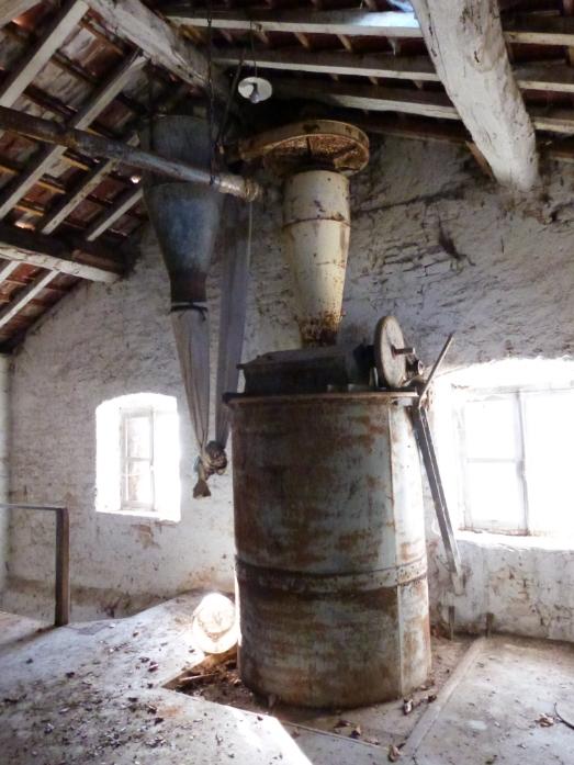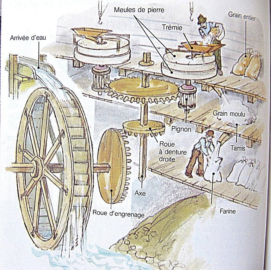 Le moulin bladier devait actionner 6 meules. Le système était constitué d’une roue à aubes verticales possédant des godets (« augets »), dite « roue de dessus » car l’eau arrivait par le dessus. L’arbre horizontal relie cette roue en bois à un rouet, roue plus petite qui fait tourner la meule sur un axe vertical.
